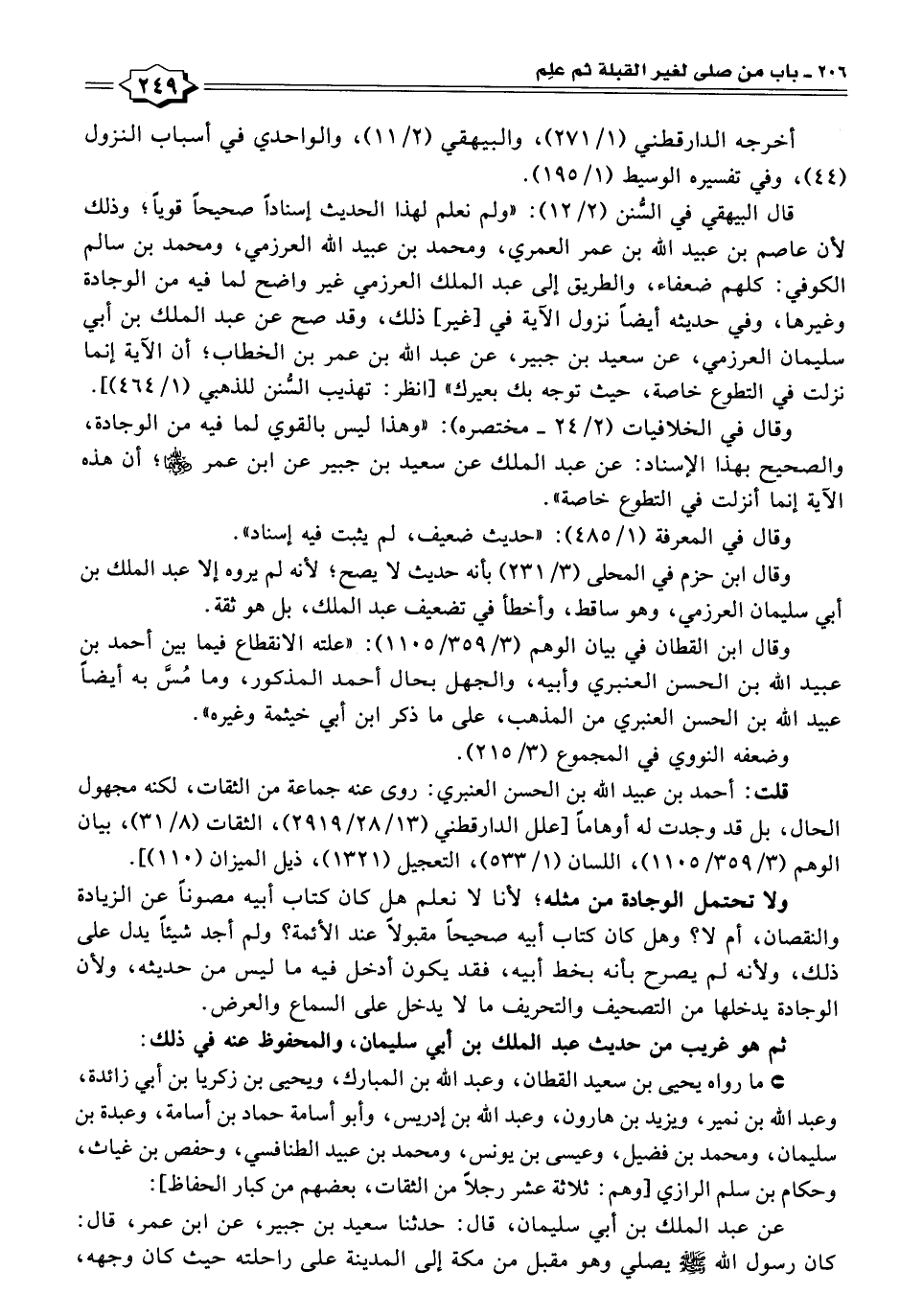 وقال في الخلافيات (٢/ ٢٤ - مختصره): "وهذا ليس بالقوي لما فيه من الوجادة، والصحيح بهذا الإسناد: عن عبد الملك عن سعيد بن جبير عن ابن عمر - رضي الله عنهما -؛ أن هذه الآية إنما أنزلت في التطوع خاصة".