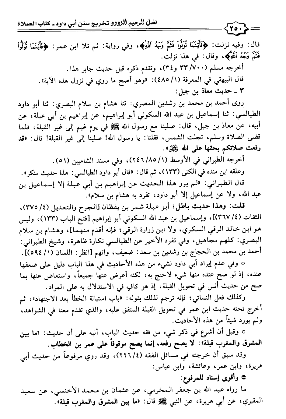 ° وفي عدم إيراد أبي داود لشيء من هذه الأحاديث في هذا الباب دليل على ضعفها عنده، إذ لو صح عنده منها شيء لاحتج به، لكنه أعرض عنها جميعًا، واستعاض عنها بما صح من حديث أنس في تحويل القبلة، إذ هو كافٍ في الاستدلال به على المراد.
