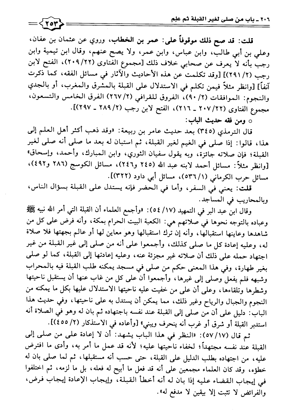 قلت: قد صحح ذلك موقوفًا على: عمر بن الخطاب، وروي عن عثمان بن عفان، وعلي بن أبي طالب، وابن عباس، وابن عمر، ولا يصح عنهم، وقال ابن تيمية وابن رجب بأنه لا يعرف عن صحابي خلاف ذلك [مجموع الفتاوى (٢٢/ ٢٠٩)، الفتح لابن رجب (٢/ ٢٩١)، [وقد تكلمت عن هذه الأحاديث والآثار في مسائل الفقه، كما ذكرت آنفًا] [وانظر مثلًا فيمن تكلم في الاستدلال على القبلة بالمشرق والمغرب، أو بالجدي والنجوم: الموافقات (٢/ ٩٠)، الفروق للقرافي (٢/ ٢٦٧) الفرق الخامس والتسعون، مجموع الفتاوى (٢٢/ ٢٠٧ - ٢١٦)، الفتح لابن رجب (٢/ ٢٨٩ - ٢٩٧)].