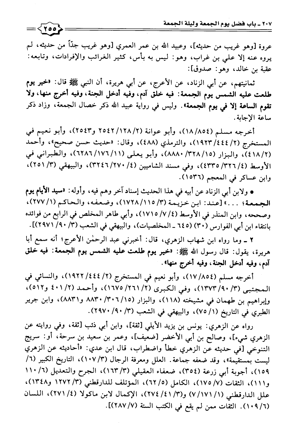 ثمانيتهم، عن أبي الزناد، عن الأعرج، عن أبي هريرة، أن النبي - صلى الله عليه وسلم - قال: "خير يوم طلعت عليه الشمس يوم الجمعة: فيه خلق آدم، وفيه أدخل الجنة، وفيه أخرج منها، ولا تقوم الساعة إلا في يوم الجمعة". وليس في رواية عبيد الله ذكر خصال الجمعة، وزاد ذكر ساعة الإجابة.