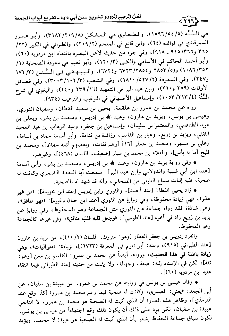 * زاد يحيى القطان [عند أحمد]، والثوري وابن إدريس [عند ابن خزيمة]: "من غير عذر"، فهي زيادة محفوظة، وفي روايةٍ عن الثوري [عند ابن حبان وغيره]: "فهو منافق"، وهي شاذة؛ فقد رواه جماعة عن الثوري مثل الجماعة وهو المحفوظ، وفي روايةٍ عن يزيد بن زريع زاد في آخره [عند الطوسي]: "وجعل قلبه قلبَ منافق"، وفي غيرها كالجماعة وهو المحفوظ.
