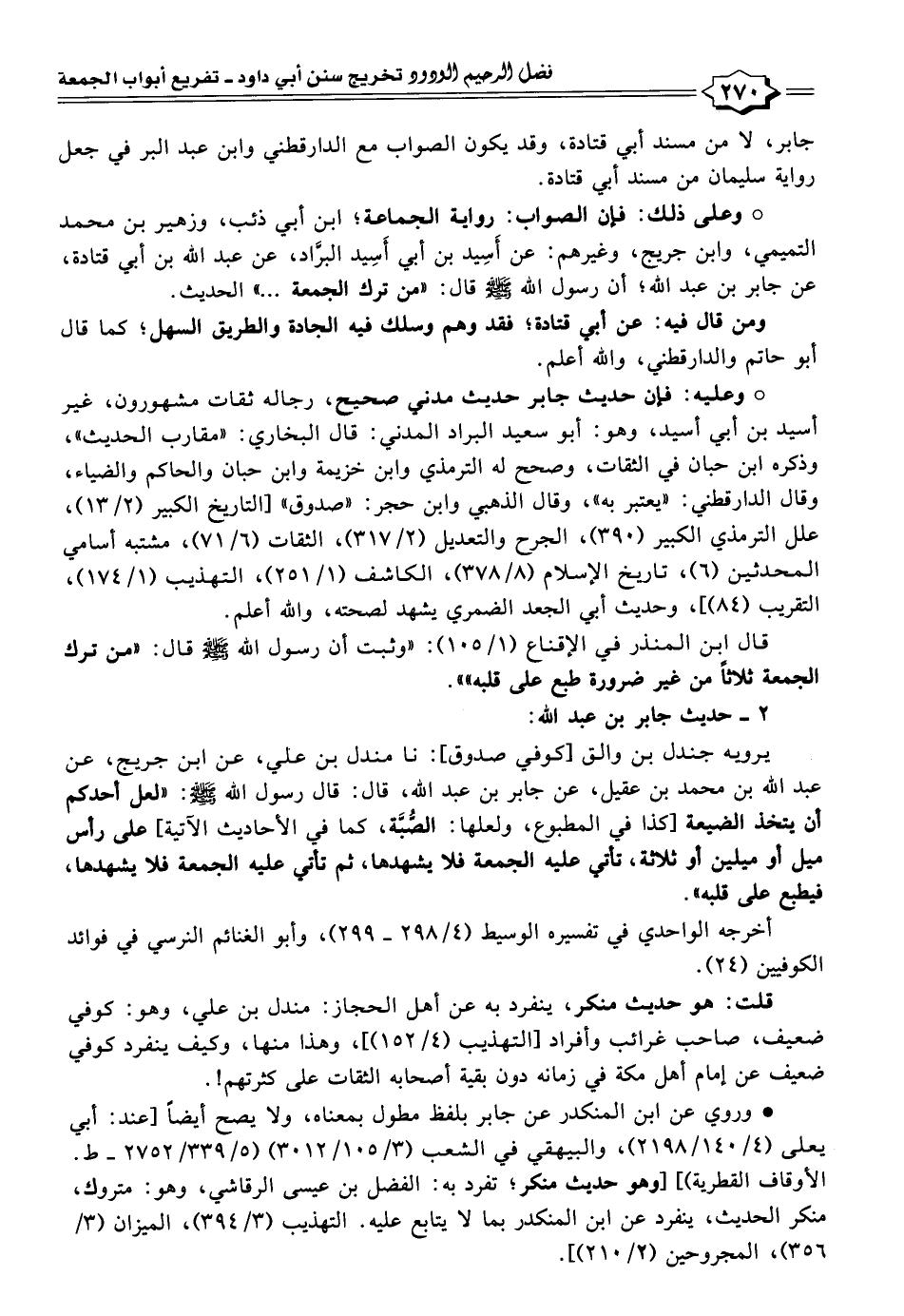 * وعليه: فإن حديث جابر حديث مدني صحيح، رجاله ثقات مشهورون، غير أسيد بن أبي أسيد، وهو: أبو سعيد البراد المدني: قال البخاري: "مقارب الحديث"، وذكره ابن حبان في الثقات، وصحح له الترمذي وابن خزيمة وابن حبان والحاكم والضياء، وقال الدارقطني: "يعتبر به"، وقال الذهبي وابن حجر: "صدوق" [التاريخ الكبير (٢/ ١٣)، علل الترمذي الكبير (٣٩٠)، الجرح والتعديل (٢/ ٣١٧)، الثقات (٦/ ٧١)، مشتبه أسامي المحدثين (٦)، تاريخ الإسلام (٨/ ٣٧٨)، الكاشف (١/ ٢٥١)، التهذيب (١/ ١٧٤)، التقريب (٨٤)]، وحديث أبي الجعد الضمري يشهد لصحته، والله أعلم.
