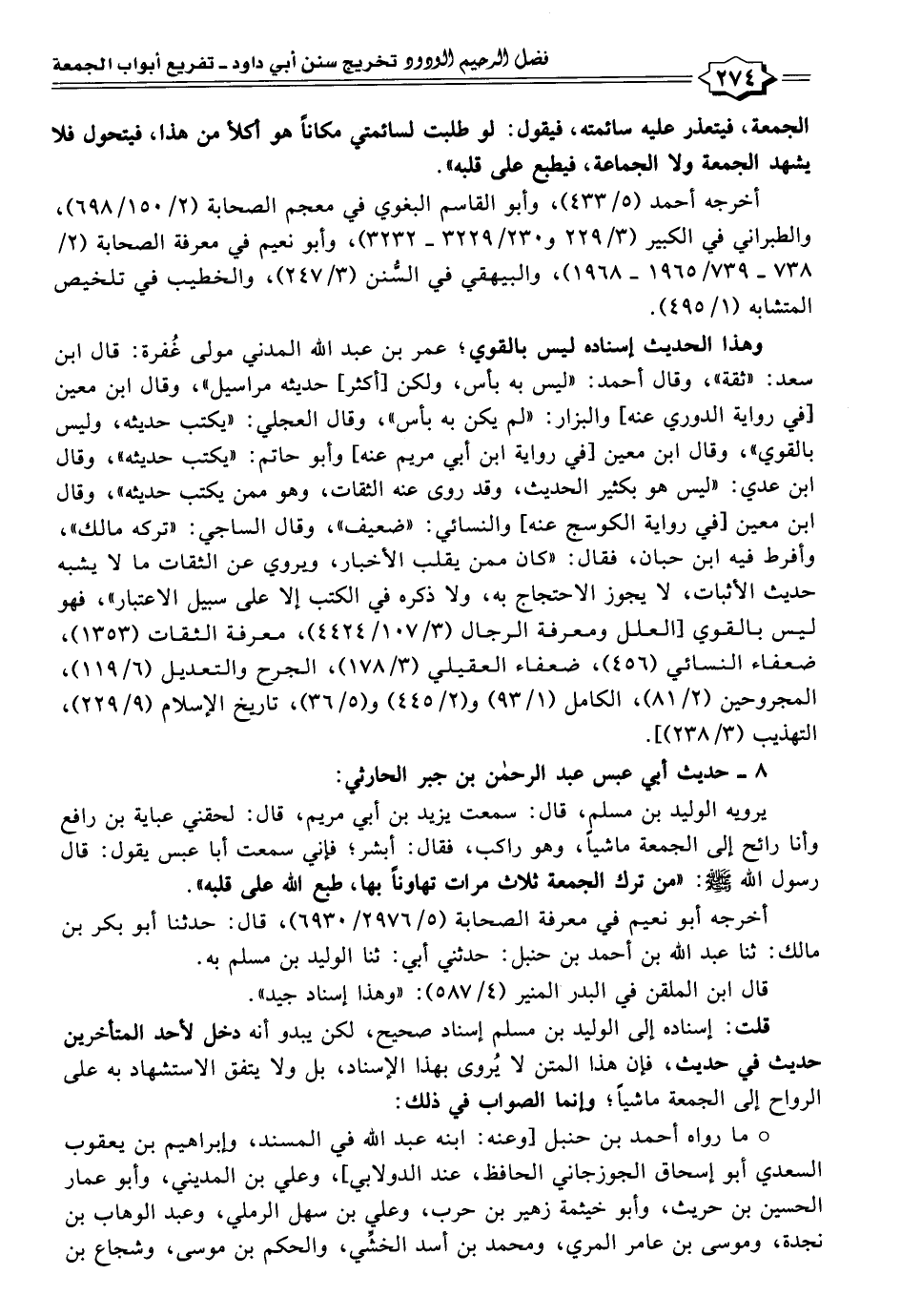 يرويه الوليد بن مسلمٍ، قال: سمعت يزيد بن أبي مريم، قال: لحقني عباية بن رافع وأنا رائح إلى الجمعة ماشيًا، وهو راكب، فقال: أبشر؛ فإني سمعت أبا عبس يقول: قال رسول الله - صلى الله عليه وسلم -: "من ترك الجمعة ثلاث مرات تهاونًا بها، طبع الله على قلبه".