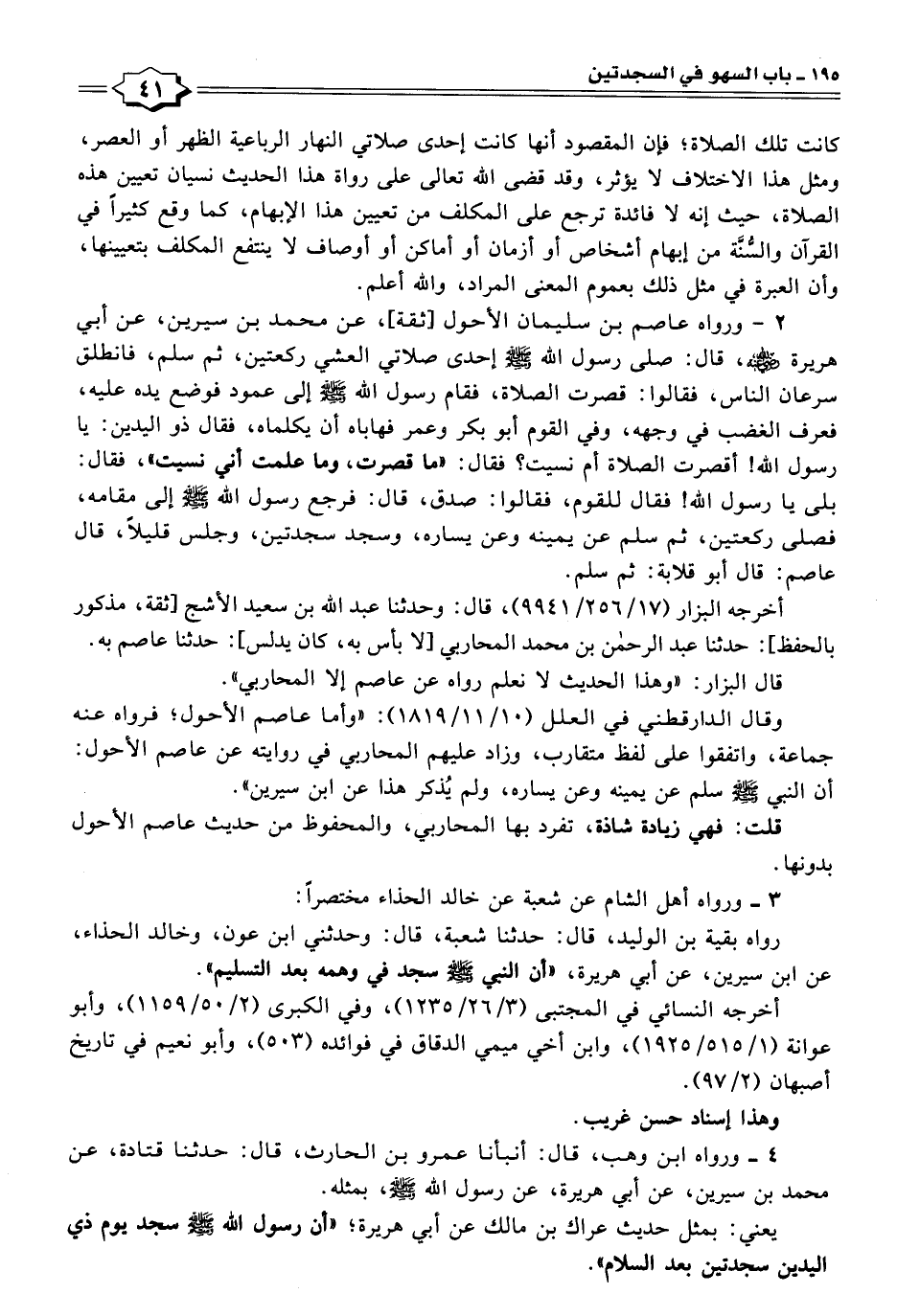 ٢ - ورواه عاصم بن سليمان الأحول [ثقة]، عن محمد بن سيرين، عن أبي هريرة - رضي الله عنه -، قال: صلى رسول الله - صلى الله عليه وسلم - إحدى صلاتي العشي ركعتين، ثم سلم، فانطلق سرعان الناس، فقالوا: قصرت الصلاة، فقام رسول الله - صلى الله عليه وسلم - إلى عمود فوضع يده عليه، فعرف الغضب في وجهه، وفي القوم أبو بكر وعمر فهاباه أن يكلماه، فقال ذو اليدين: يا رسول الله! أقصرت الصلاة أم نسيت؟ فقال: "ما قصرت، وما علمت أني نسيت"، فقال: بلى يا رسول الله! فقال للقوم، فقالوا: صدق، قال: فرجع رسول الله - صلى الله عليه وسلم - إلى مقامه، فصلى ركعتين، ثم سلم عن يمينه وعن يساره، وسجد سجدتين، وجلس قليلًا، قال عاصم: قال أبو قلابة: ثم سلم.