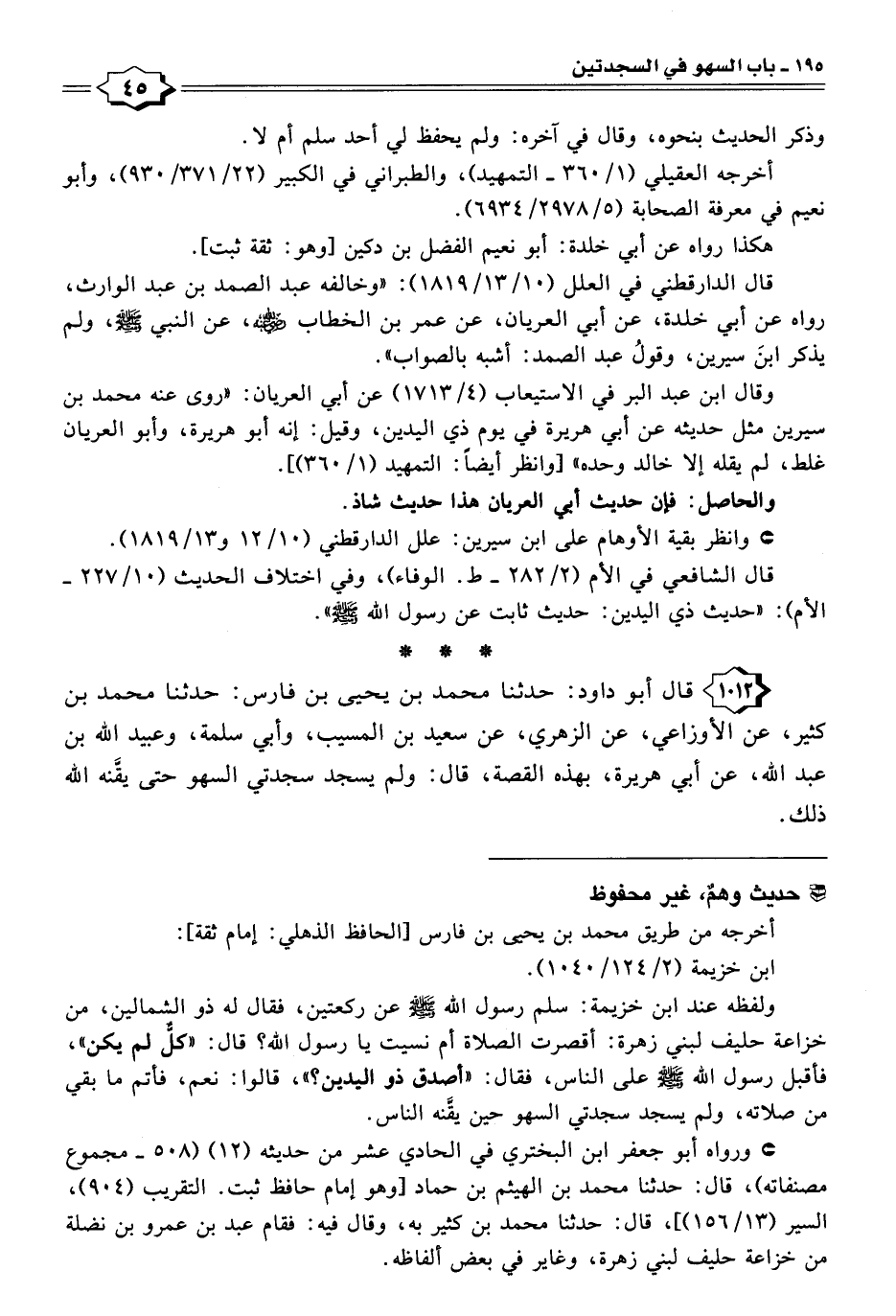 ١٠١٢ - قال أبو داود: حدثنا محمد بن يحيى بن فارس: حدثنا محمد بن كثير، عن الأوزاعي، عن الزهري، عن سعيد بن المسيب، وأبي سلمة، وعبيد الله بن عبد الله، عن أبي هريرة، بهذه القصة، قال: ولم يسجد سجدتي السهو حتى يقَّنه الله ذلك.