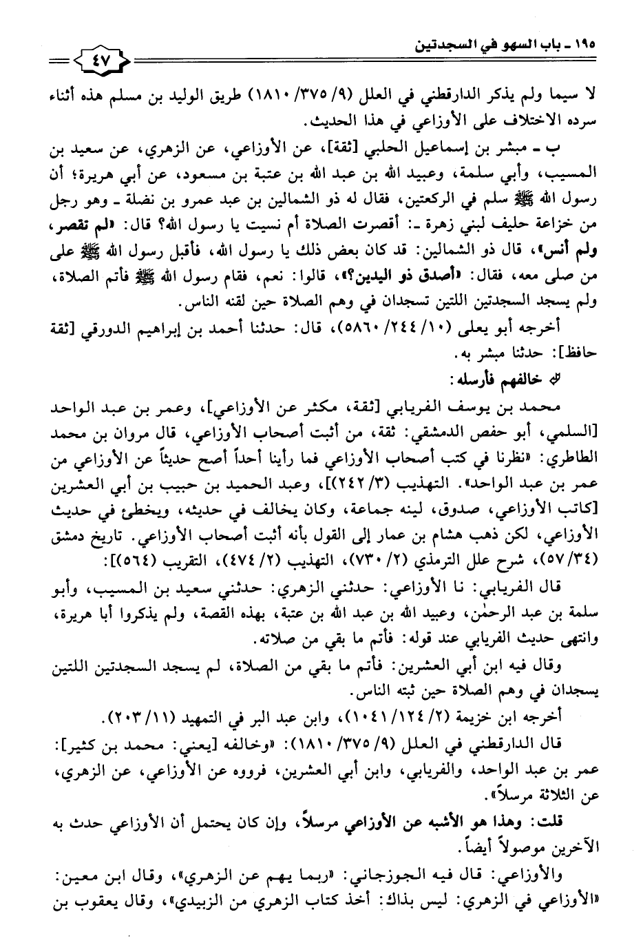ب - مبشر بن إسماعيل الحلبي [ثقة]، عن الأوزاعي، عن الزهري، عن سعيد بن المسيب، وأبي سلمة، وعبيد الله بن عبد الله بن عتبة بن مسعود، عن أبي هريرة؛ أن رسول الله - صلى الله عليه وسلم - سلم في الركعتين، فقال له ذو الشمالين بن عبد عمرو بن نضلة - وهو رجل من خزاعة حليف لبني زهرة -: أقصرت الصلاة أم نسيت يا رسول الله؟ قال: "لم تقصر، ولم أنس"، قال ذو الشمالين: قد كان بعض ذلك يا رسول الله، فأقبل رسول الله - صلى الله عليه وسلم - على من صلى معه، فقال: "أصدق ذو اليدين؟ "، قالوا: نعم، فقام رسول الله - صلى الله عليه وسلم - فأتم الصلاة، ولم يسجد السجدتين اللتين تسجدان في وهم الصلاة حين لقنه الناس.