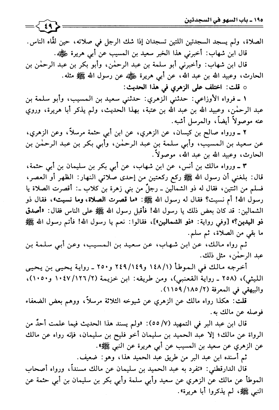 ٣ - ورواه مالك بن أنس، عن ابن شهاب، عن أبي بكر بن سليمان بن أبي حثمة، قال: بلغني أن رسول الله - صلى الله عليه وسلم - ركع ركعتين من إحدى صلاتي النهار: الظهر أو العصر، فسلم من اثنتين، فقال له ذو الشمالين - رجلٌ من بني زهرة بن كلاب -: أقصرت الصلاة يا رسول الله! أم نسيت؟ فقال له رسول الله - صلى الله عليه وسلم -: "ما قصرت الصلاة، وما نسيت"، فقال ذو الشمالين: قد كان بعض ذلك يا رسول الله! فأقبل رسول الله - صلى الله عليه وسلم - على الناس فقال: "أصدق ذو اليدين؟ " [وفي رواية: "ذو الشمالين"]، فقالوا: نعم يا رسول الله! فأتم رسول الله - صلى الله عليه وسلم - ما بقي من الصلاة، ثم سلم.