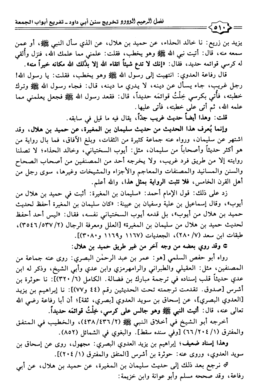 * نرجع بعد ذلك إلى حديث سليمان بن المغيرة، عن حميد بن هلال، عن أبي رفاعة، وقد صححه مسلم وأبو عوانة وابن خزيمة: