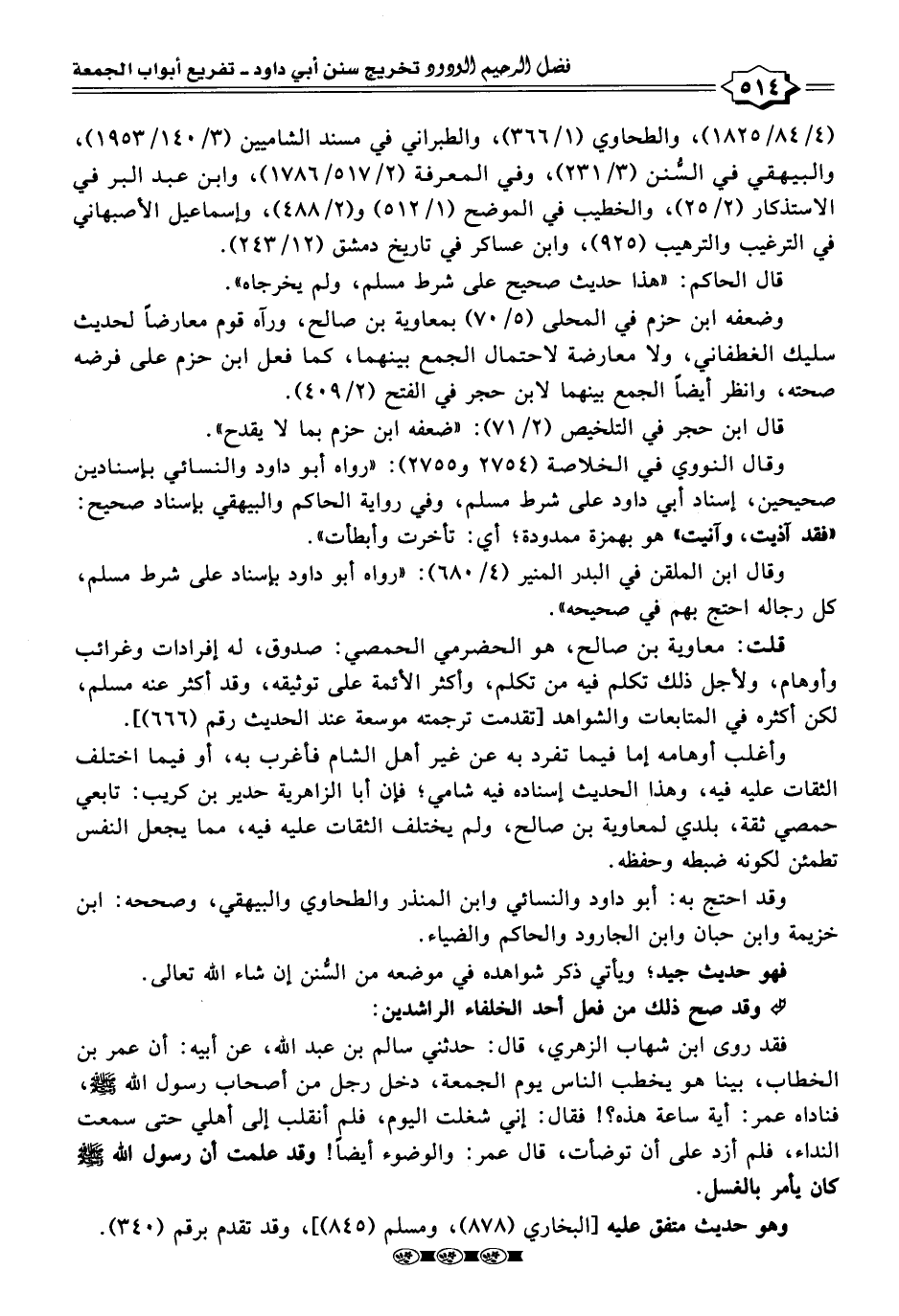 قلت: معاوية بن صالح، هو الحضرمي الحمصي: صدوق، له إفرادات وغرائب وأوهام، ولأجل ذلك تكلم فيه من تكلم، وأكثر الأئمة على توثيقه، وقد أكثر عنه مسلم، لكن أكثره في المتابعات والشواهد [تقدمت ترجمته موسعة عند الحديث رقم (٦٦٦)].