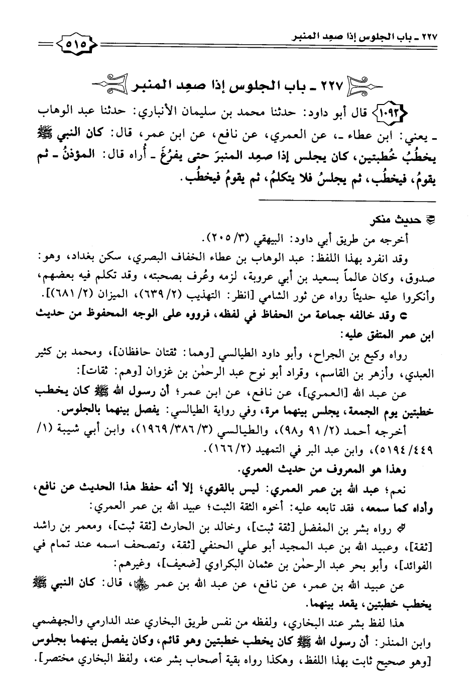 ١٠٩٢ - قال أبو داود: حدثنا محمد بن سليمان الأنباري: حدثنا عبد الوهاب - يعني: ابن عطاء -، عن العمري، عن نافع، عن ابن عمر، قال: كان النبي - صلى الله عليه وسلم - يخطُبُ خُطبتين، كان يجلس إذا صعِد المنبرَ حتى يفرُغَ - أُراه قال: المؤذنُ - ثم يقومُ، فيخطُب، ثم يجلسُ فلا يتكلمُ، ثم يقومُ فيخطُب.