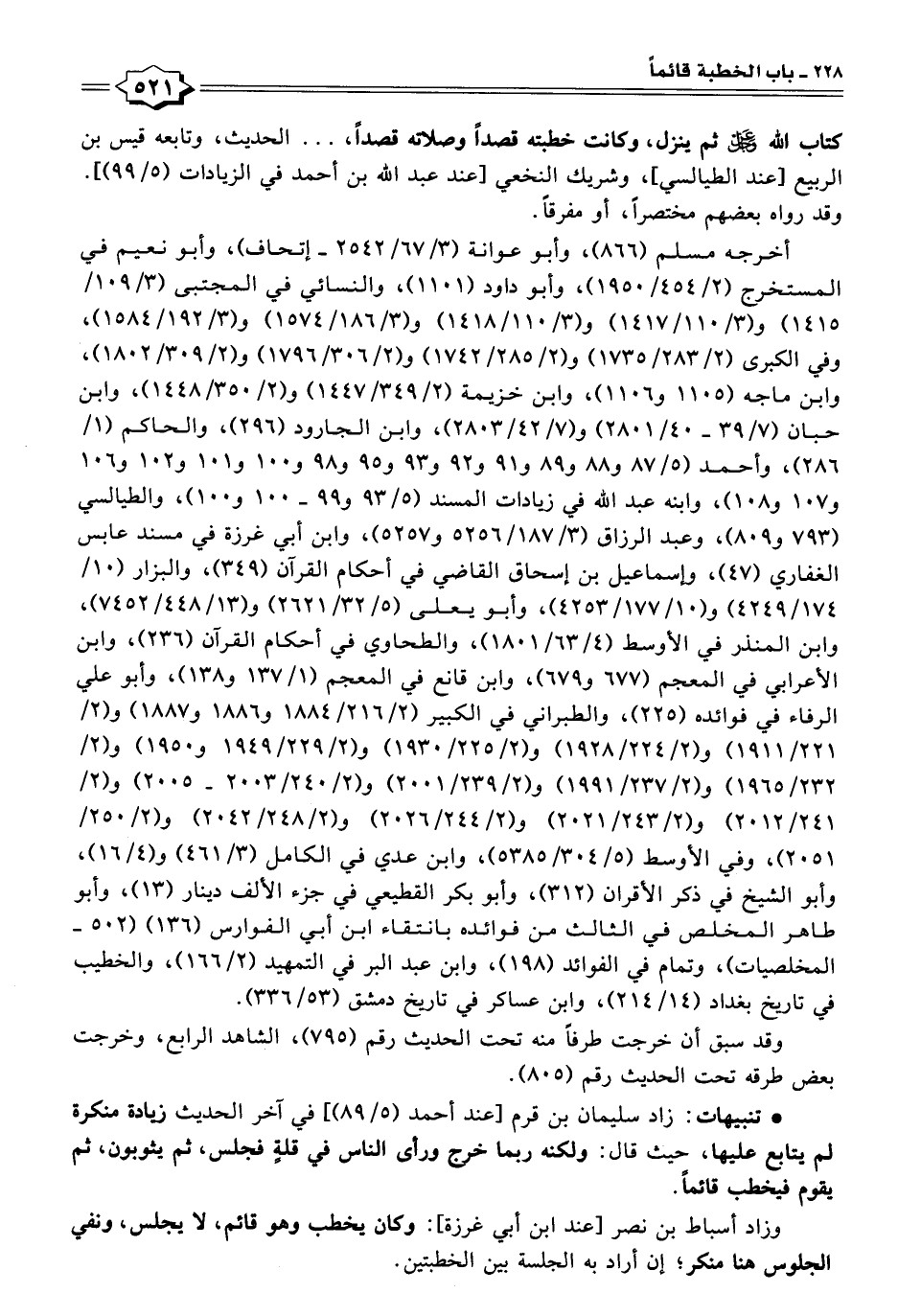كتاب الله - صلى الله عليه وسلم - ثم ينزل، وكانت خطبته قصدًا وصلاته قصدًا، ... الحديث، وتابعه قيس بن الربيع [عند الطيالسي]، وشريك النخعي [عند عبد الله بن أحمد في الزيادات (٥/ ٩٩)]. وقد رواه بعضهم مختصرًا، أو مفرقًا.