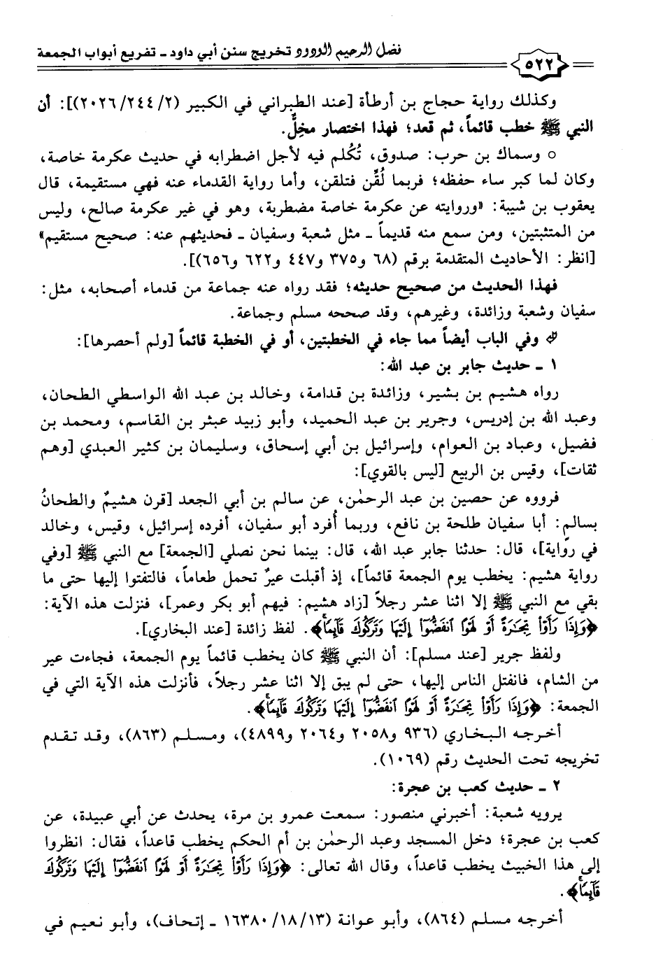يرويه شعبة: أخبرني منصور: سمعت عمرو بن مرة، يحدث عن أبي عبيدة، عن كعب بن عجرة؛ دخل المسجد وعبد الرحمن بن أم الحكم يخطب قاعدًا، فقال: انظروا إلي هذا الخبيث يخطب قاعدًا، وقال الله تعالى: {وَإِذَا رَأَوْا تِجَارَةً أَوْ لَهْوًا انْفَضُّوا إِلَيْهَا وَتَرَكُوكَ قَائِمًا}.
