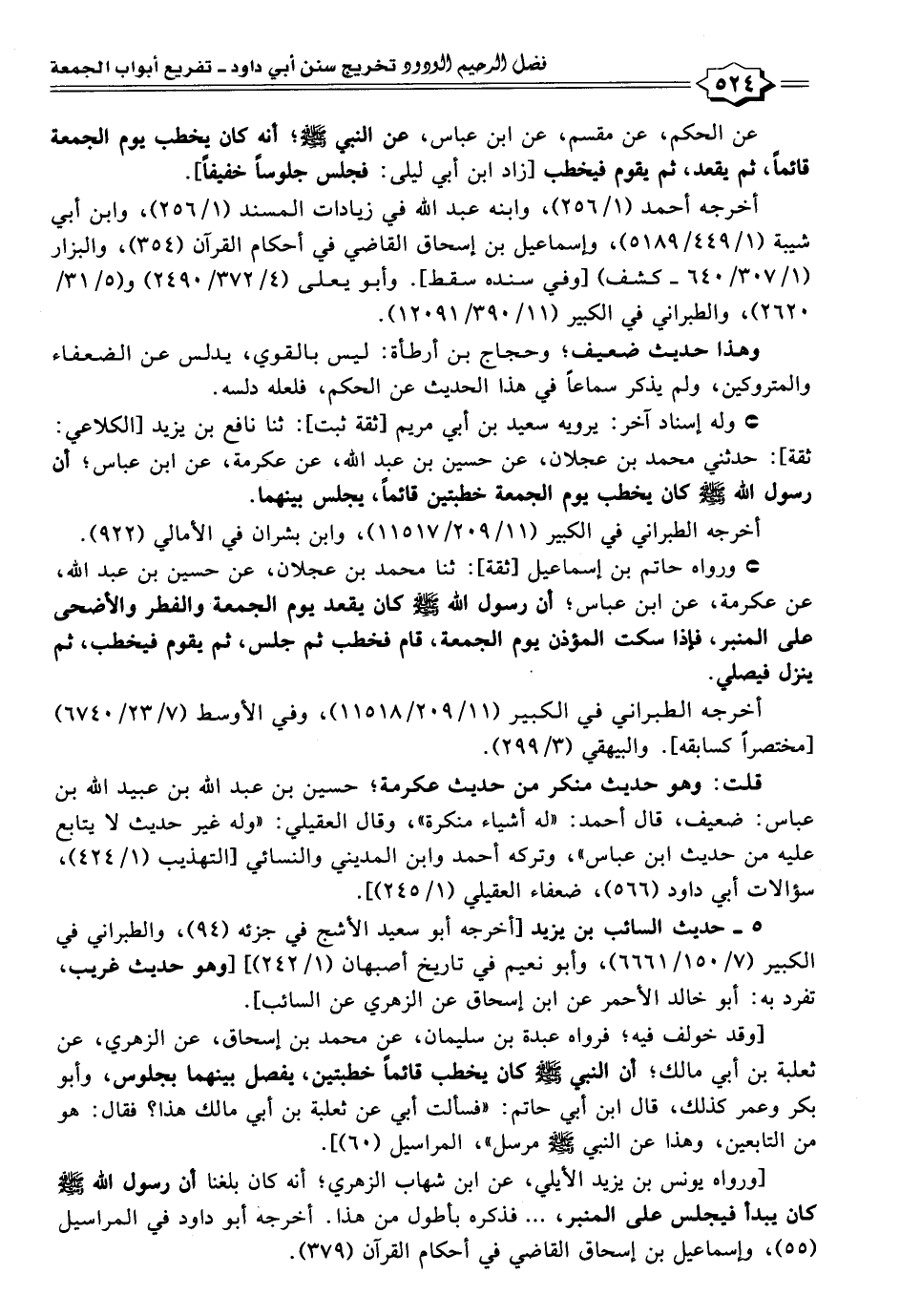 عن الحكم، عن مقسم، عن ابن عباس، عن النبي - صلى الله عليه وسلم -؛ أنه كان يخطب يوم الجمعة قائمًا، ثم يقعد، ثم يقوم فيخطب [زاد ابن أبي ليلى: فجلس جلوسًا خفيفًا].