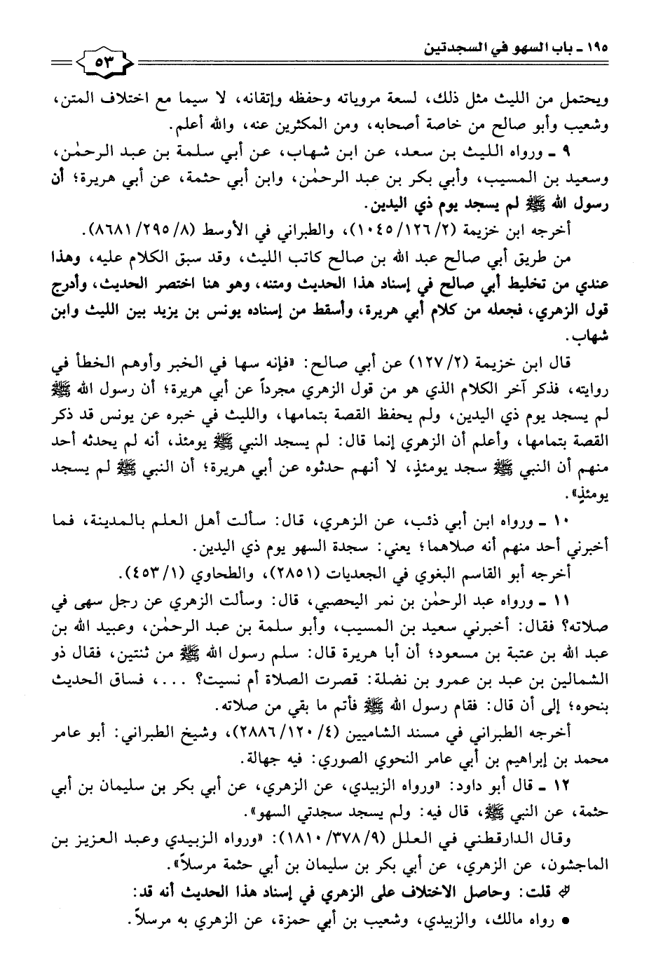 ٩ - ورواه الليث بن سعد، عن ابن شهاب، عن أبى سلمة بن عبد الرحمن، وسعيد بن المسيب، وأبي بكر بن عبد الرحمن، وابن أبى حثمة، عن أبى هريرة؛ أن رسول الله - صلى الله عليه وسلم - لم يسجد يوم ذي اليدين.