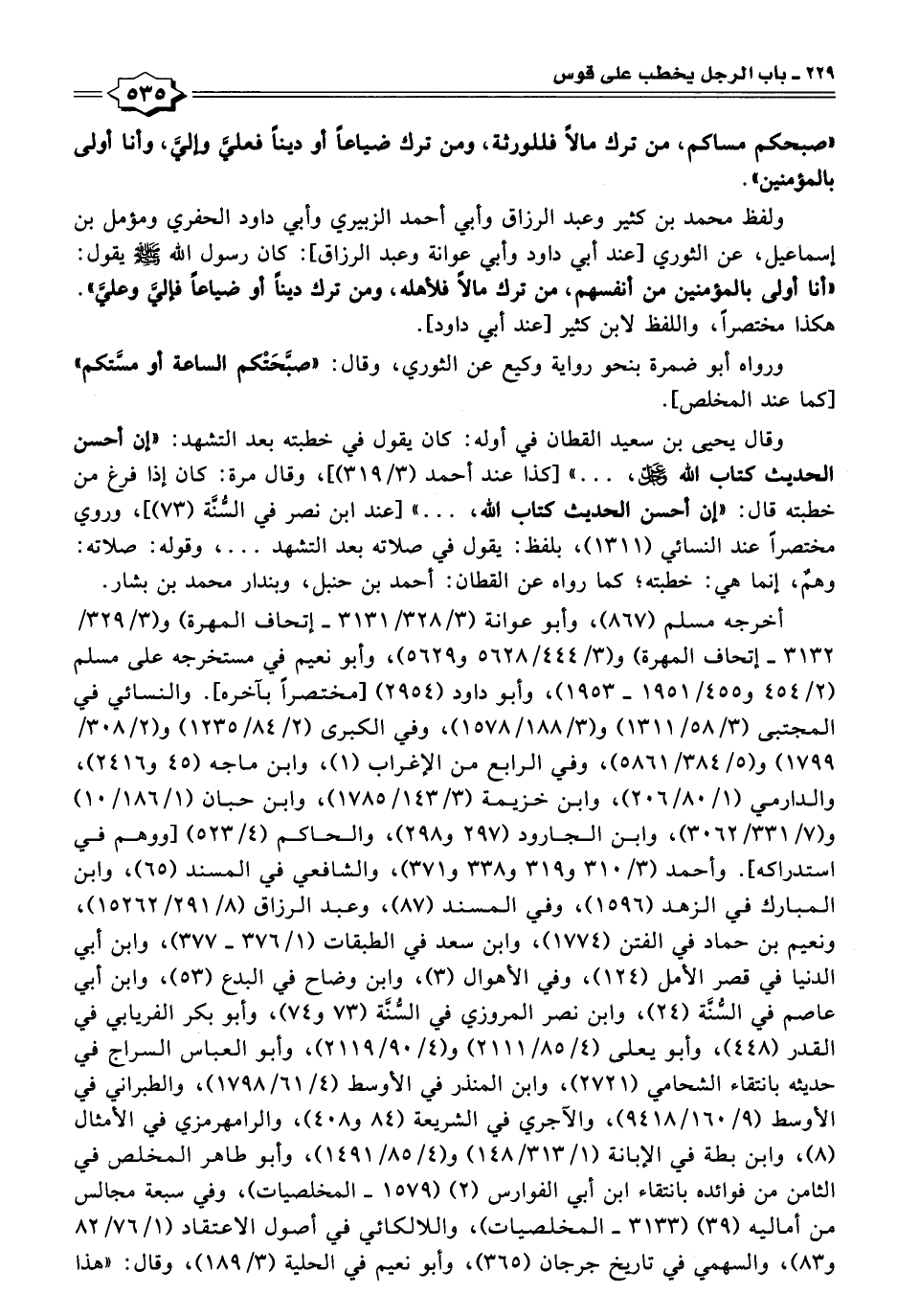 أخرجه مسلم (٨٦٧)، وأبو عوانة (٣/ ٣٢٨/ ٣١٣١ - إتحاف المهرة) و (٣/ ٣٢٩/ ٣١٣٢ - إتحاف المهرة) و (٣/ ٥٦٢٨/٤٤٤ و ٥٦٢٩)، وأبو نعيم في مستخرجه على مسلم (٢/ ٤٥٤ و ٤٥٥/ ١٩٥١ - ١٩٥٣)، وأبو داود (٢٩٥٤) [مختصرًا بآخره]. والنسائي في المجتبى (٣/ ٥٨/ ١٣١١) و (٣/ ١٨٨/ ١٥٧٨)، وفي الكبرى (٢/ ٨٤/ ١٢٣٥) و (٢/ ٣٠٨/ ١٧٩٩) و (٥/ ٣٨٤/ ٥٨٦١)، وفي الرابع من الإغراب (١)، وابن ماجه (٤٥ و ٢٤١٦)، والدارمي (١/ ٨٠/ ٢٠٦)، وابن خزيمة (٣/ ١٤٣/ ١٧٨٥)، وابن حبان (١/ ١٨٦/ ١٠) و (٧/ ٣٣١/ ٣٠٦٢)، وابن الجارود (٢٩٧ و ٢٩٨)، والحاكم (٤/ ٥٢٣) [ووهم في استدراكه]. وأحمد (٣/ ٣١٠ و ٣١٩ و ٣٣٨ و ٣٧١)، والشافعي في المسند (٦٥)، وابن المبارك في الزهد (١٥٩٦)، وفي المسند (٨٧)، وعبد الرزاق (٨/ ٢٩١/ ١٥٢٦٢)، ونعيم بن حماد في الفتن (١٧٧٤)، وابن سعد في الطبقات (١/ ٣٧٦ - ٣٧٧)، وابن أبي الدنيا في قصر الأمل (١٢٤)، وفي الأهوال (٣)، وابن وضاح في البدع (٥٣)، وابن أبي عاصم في السُّنَّة (٢٤)، وابن نصر المروزي في السُّنَّة (٧٣ و ٧٤)، وأبو بكر الفريابي في القدر (٤٤٨)، وأبو يعلى (٤/ ٨٥/ ٢١١١) و (٤/ ٩٠/ ٢١١٩)، وأبو العباس السراج في حديثه بانتقاء الشحامي (١ ٢٧٢)، وابن المنذر في الأوسط (٤/ ٦١/ ١٧٩٨)، والطبراني في الأوسط (٩/ ١٦٠/ ١٨ ٩٤)، والآجري في الشريعة (٨٤ و ٤٠٨)، والرامهرمزي في الأمثال (٨)، وابن بطة في الإبانة (١/ ٣١٣/ ١٤٨) و (٤/ ٨٥/ ١٤٩١)، وأبو طاهر المخلص في الثامن من فوائده بانتقاء ابن أبي الفوارس (٢) (١٥٧٩ - المخلصيات)، وفي سبعة مجالس من أماليه (٣٩) (٣١٣٣ - المخلصيات)، واللالكائي في أصول الاعتقاد (١/ ٧٦/ ٨٢ و ٨٣)، والسهمي في تاريخ جرجان (٣٦٥)، وأبو نعيم في الحلية (٣/ ١٨٩)، وقال: "هذا