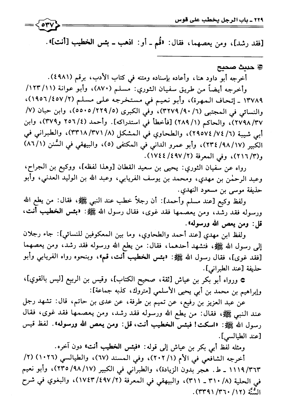 عن عبد العزيز بن رفيع، عن تميم بن طرفة، عن عدى بن حاتم، قال: تشهد رجل عند النبي - صلى الله عليه وسلم -، فقال: من يطع الله ورسوله فقد رشد، ومن يعصمها فقد غوى، فقال رسول الله - صلى الله عليه وسلم -: "اسكت! فبئس الخطيب أنت، قل: ومن يعص الله ورسوله". لفظ قيس [عند الطيالسي].