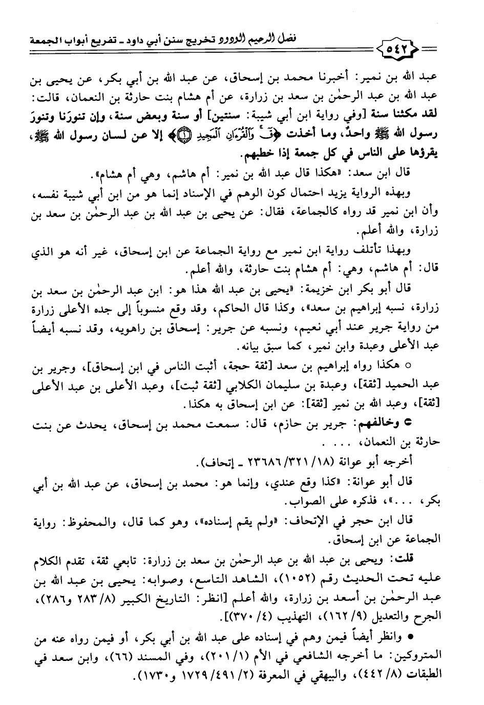 وبهذه الرواية يزيد احتمال كون الوهم في الإسناد إنما هو من ابن أبي شيبة نفسه، وأن ابن نمير قد رواه كالجماعة، فقال: عن يحيى بن عبد الله بن عبد الرحمن بن صعد بن زرارة، والله أعلم.
