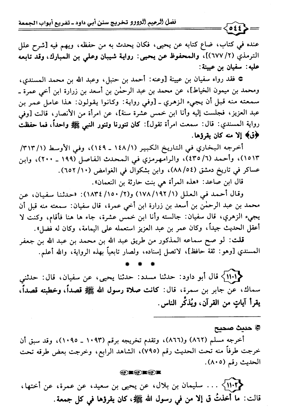 ١١٠١ - قال أبو داود: حدثنا مسدد: حدثنا يحيى، عن سفيان، قال: حدثني سماك، عن جابر بن سمرة، قال: كانت صلاة رسول الله - صلى الله عليه وسلم - قصدًا، وخطبته قصدًا، يقرأ آياتٍ من القرآن، ويُذكِّر الناس.
