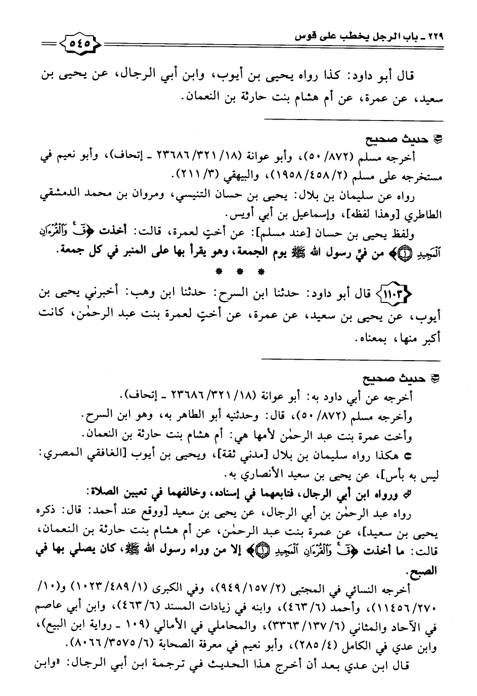 رواه عبد الرحمن بن أبي الرجال، عن يحيى بن سعيد [ووقع عند أحمد: قال: ذكره يحيى بن سعيد]، عن عمرة بنت عبد الرحمن، عن أم هشام بنت حارثة بن النعمان، قالت: ما أخذت {ق وَالْقُرْآنِ الْمَجِيدِ (١)} إلا من وراء رسول الله - صلى الله عليه وسلم -، كان يصلي بها في الصبح.