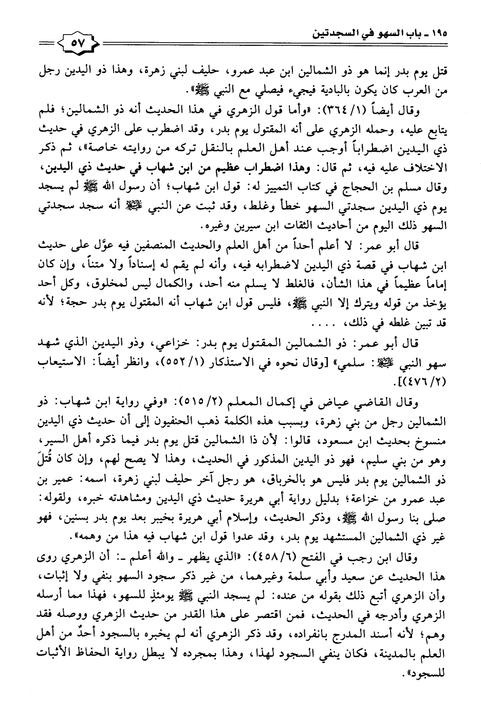 قال أبو عمر: لا أعلم أحدًا من أهل العلم والحديث المنصفين فيه عوَّل على حديث ابن شهاب في قصة ذي اليدين لاضطرابه فيه، وأنه لم يقم له إسنادًا ولا متنًا، وإن كان إمامًا عظيمًا في هذا الشأن، فالغلط لا يسلم منه أحد، والكمال ليس لمخلوق، وكل أحد يؤخذ من قوله ويترك إلا النبي - صلى الله عليه وسلم -، فليس قول ابن شهاب أنه المقتول يوم بدر حجة؛ لأنه قد تبين غلطه في ذلك،. . .
