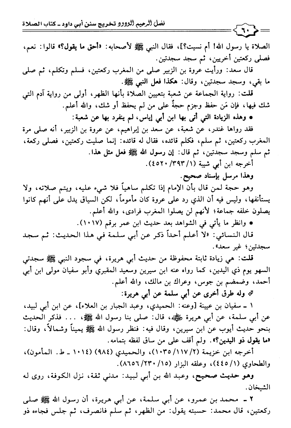 قلت: هي زيادة ثابتة محفوظة من حديث أبى هريرة، في سجود النبي - صلى الله عليه وسلم - سجدتي السهو يوم ذي اليدين، كما رواه عنه ابن سيرين وسعيد المقبري وأبو سفيان مولى ابن أبى أحمد، وضمضم بن جوس، وعراك بن مالك، والله أعلم.