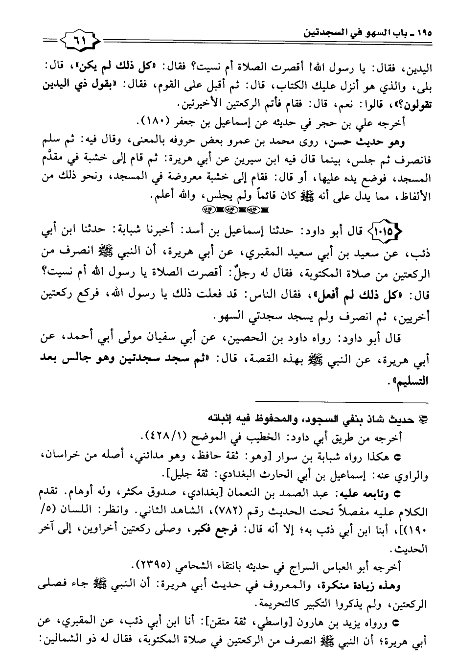 وهو حديث حسن، روى محمد بن عمرو بعض حروفه بالمعنى، وقال فيه: ثم سلم فانصرف ثم جلس، بينما قال فيه ابن سيرين عن أبى هريرة: ثم قام إلى خشبة في مقدَّم المسجد، فوضع يده عليها، أو قال: فقام إلى خشبة معروضة في المسجد، ونحو ذلك من الألفاظ، مما يدل على أنه - صلى الله عليه وسلم - كان قائمًا ولم يجلس، والله أعلم.