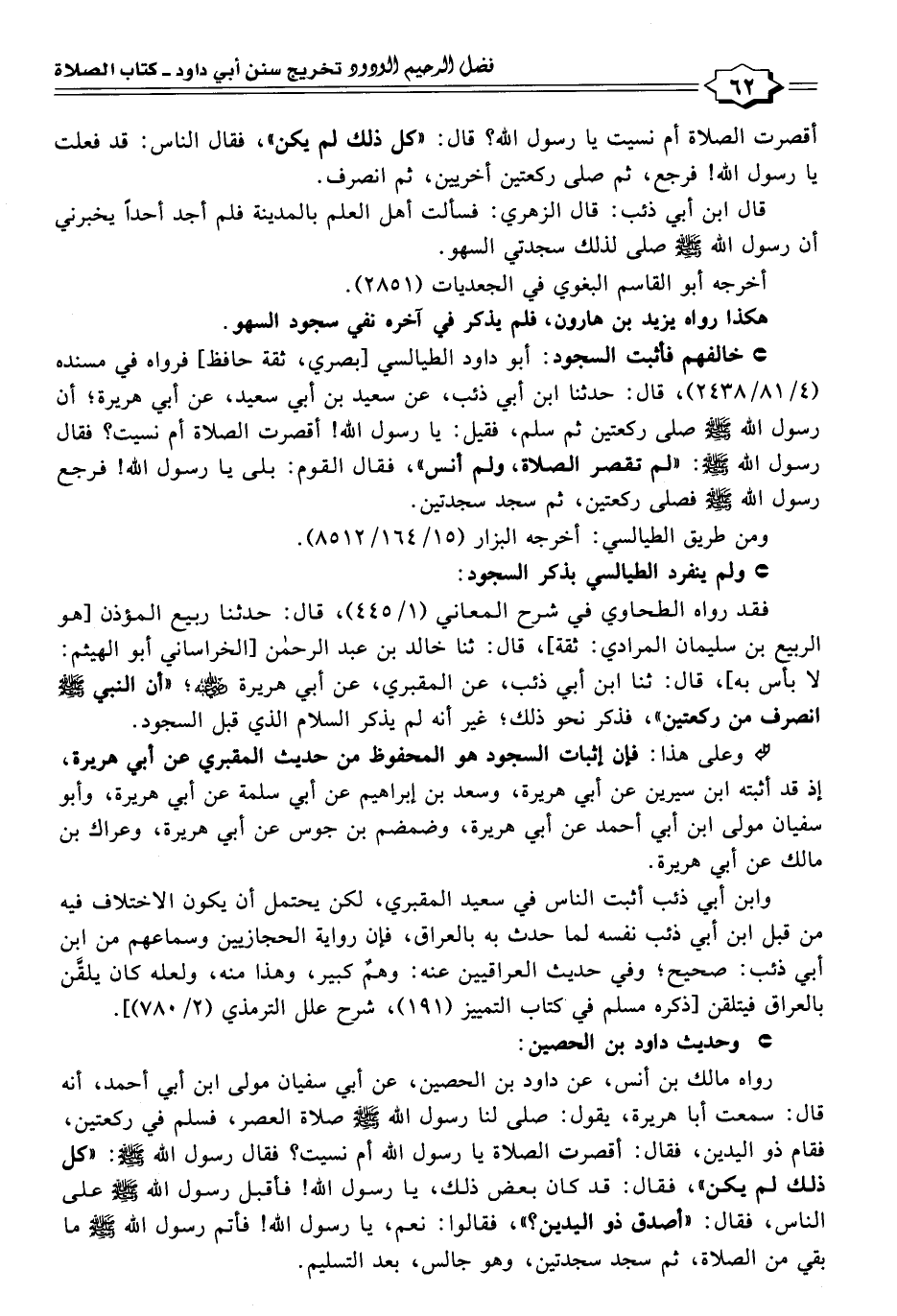 ° خالفهم فأثبت السجود: أبو داود الطيالسي أبصري، ثقة حافظ، فرواه في مسنده (٤/ ٢٤٣٨/٨١)، قال: حدثنا ابن أبى ذئب، عن سعيد بن أبى سعيد، عن أبى هريرة؛ أن رسول الله - صلى الله عليه وسلم - صلى ركعتين ثم سلم، فقيل: يا رسول الله! أقصرت الصلاة أم نسيت؟ فقال رسول الله - صلى الله عليه وسلم -: "لم تقصر الصلاة، ولم أنس"، فقال القوم: بلى يا رسول الله! فرجع رسول الله - صلى الله عليه وسلم - فصلى ركعتين، ثم سجد سجدتين.