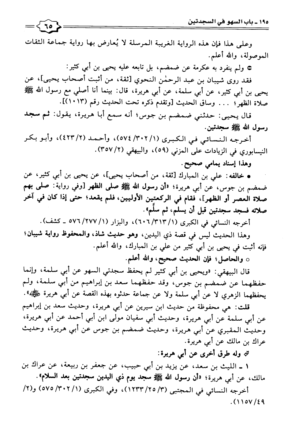 قال البيهقي: "ويحيى بن أبى كثير لم يحفظ سجدتي السهو عن أبى سلمة، وإنما حفظهما عن ضمضم بن جوس، وقد حفظهما سعد بن إبراهيم من أبى سلمة، ولم يحفظهما الزهري لا عن أبى سلمة ولا عن جماعة حدثوه بهذه القصة عن أبى هريرة - رضي الله عنه -".