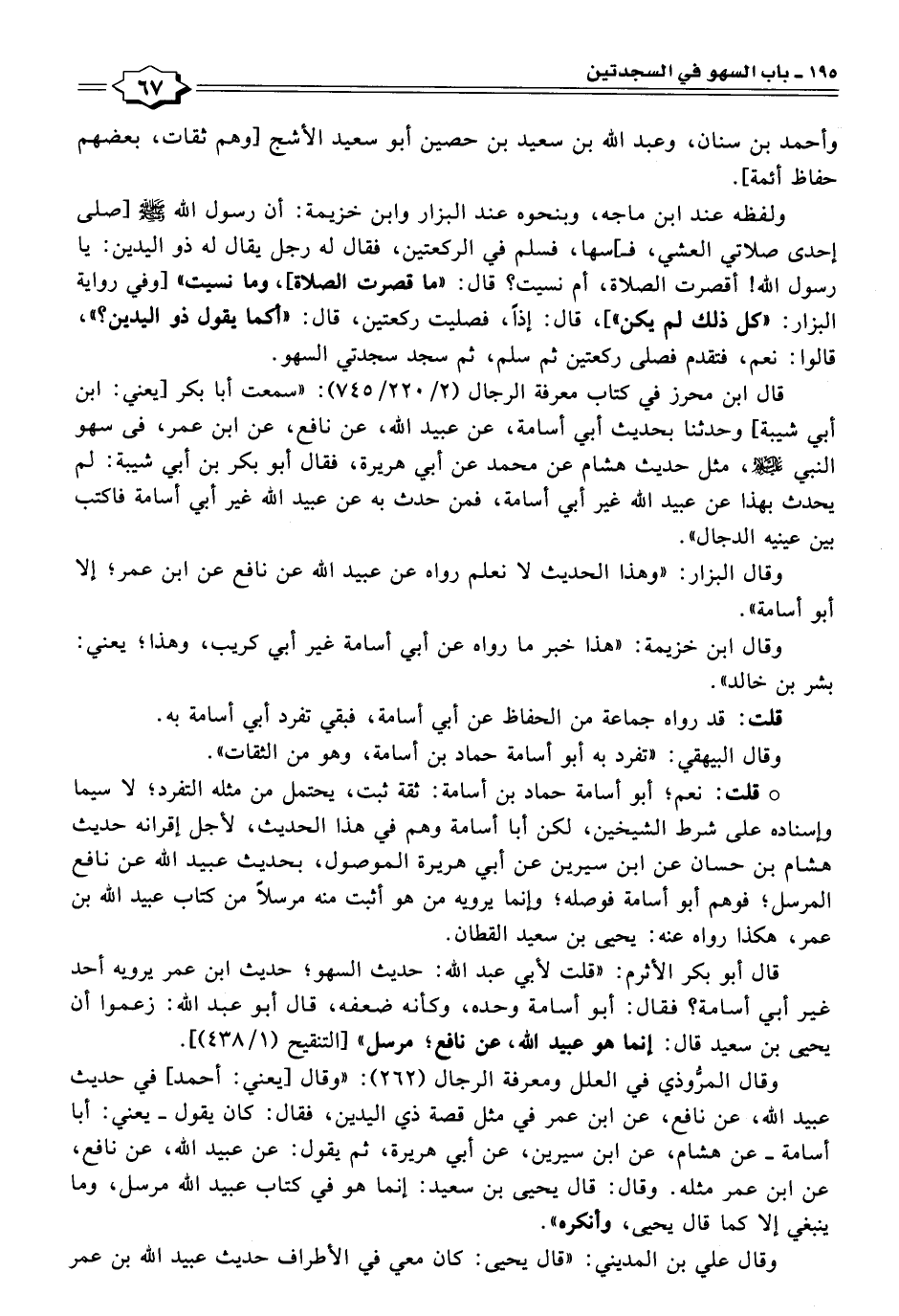 قال أبو بكر الأثرم: "قلت لأبي عبد الله: حديث السهو؛ حديث ابن عمر يرويه أحد غير أبى أسامة؟ فقال: أبو أسامة وحده، وكأنه ضعفه، قال أبو عبد الله: زعموا أن يحيى بن سعيد قال: إنما هو عبيد الله، عن نافع؛ مرسل" [التنقيح (١/ ٤٣٨)].