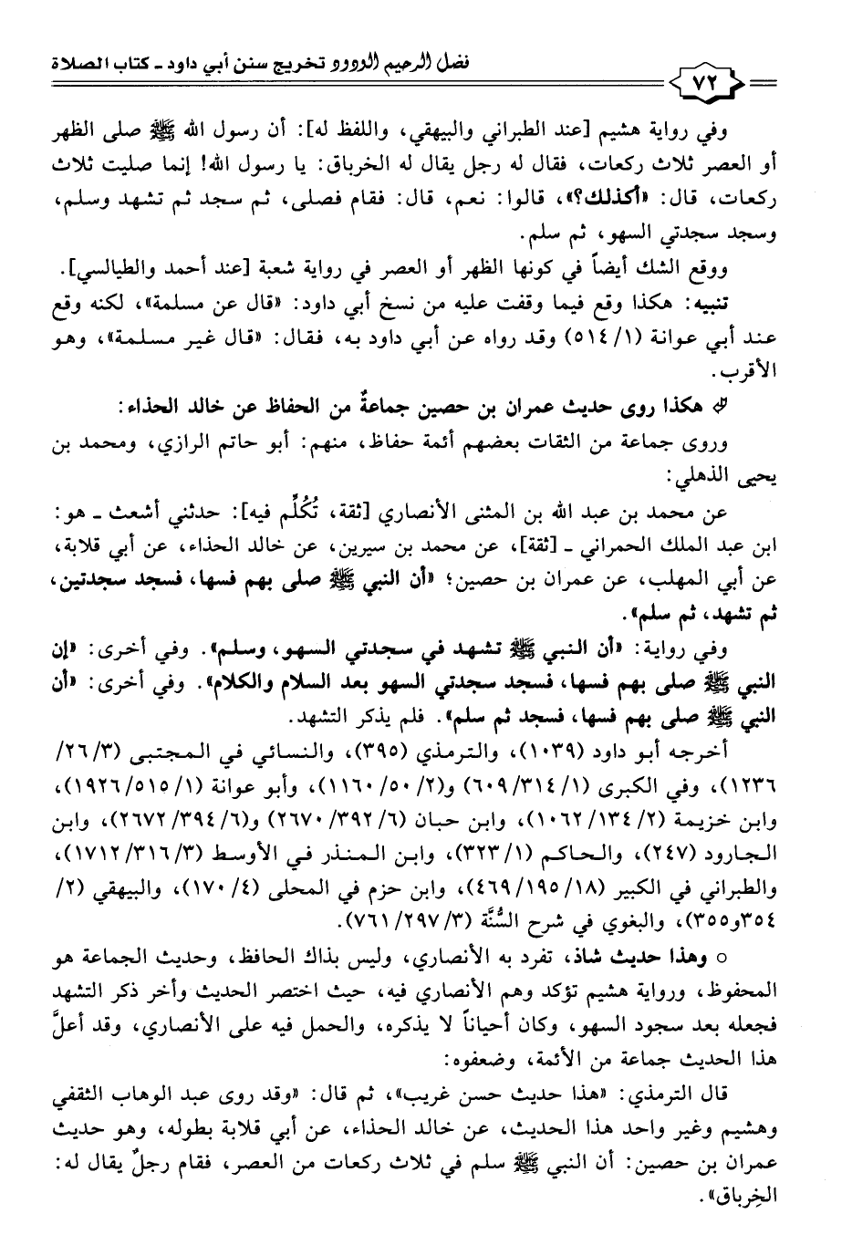° وهذا حديث شاذ، تفرد به الأنصاري، وليس بذاك الحافظ، وحديث الجماعة هو المحفوظ، ورواية هشيم تؤكد وهم الأنصاري فيه، حيث اختصر الحديث وأخر ذكر التشهد فجعله بعد سجود السهو، وكان أحيانًا لا يذكره، والحمل فيه على الأنصاري، وقد أعلَّ هذا الحديث جماعة من الأئمة، وضعفوه: