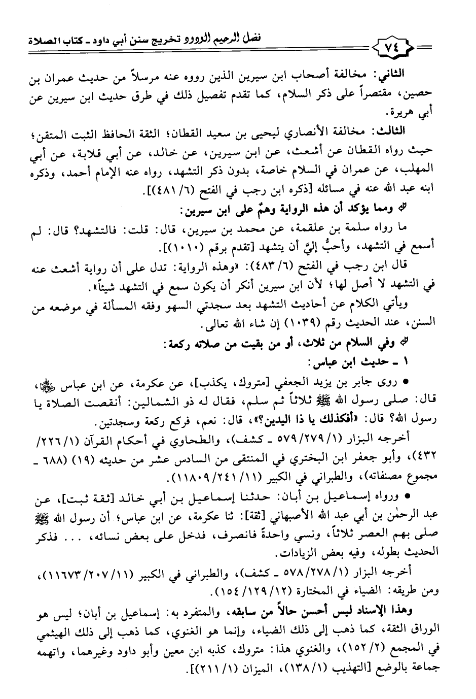 • روى جابر بن يزيد الجعفي [متروك، يكذب]، عن عكرمة، عن ابن عباس - رضي الله عنهما -، قال: صلى رسول الله - صلى الله عليه وسلم - ثلاثًا ثم سلم، فقال له ذو الشمالين: أنقصت الصلاة يا رسول الله؟ قال: "أفكذلك يا ذا اليدين؟ "، قال: نعم، فركع ركعة وسجدتين.