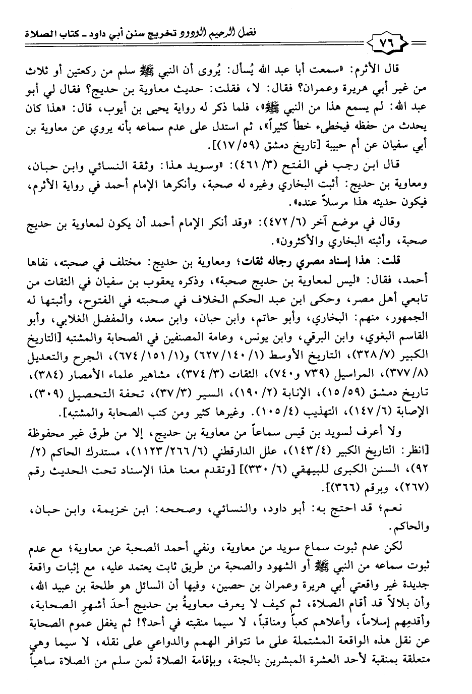 لكن عدم ثبوت سماع سويد من معاوية، ونفي أحمد الصحبة عن معاوية؛ مع عدم ثبوت سماعه من النبي - صلى الله عليه وسلم - أو الشهود والصحبة من طريق ثابت يعتمد عليه، مع إثبات واقعة جديدة غير واقعتي أبى هريرة وعمران بن حصين، وفيها أن السائل هو طلحة بن عبيد الله، وأن بلالًا قد أقام الصلاة، ثمِ كيف لا يعرف معاويةُ بن حديج أحدَ أشهرِ الصحابة، وأقدمِهم إسلامًا، وأعلاهم كعبًا ومناقبًا، لا سيما منقبته في أحد؟! ثم يغفل عموم الصحابة عن نقل هذه الواقعة المشتملة على ما تتوافر الهمم والدواعي على نقله، لا سيما وهي متعلقة بمنقبة لأحد العشرة المبشرين بالجنة، وبإقامة الصلاة لمن سلم من الصلاة ساهيًا