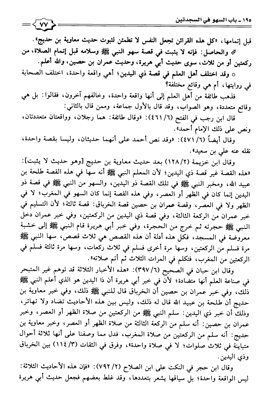 وقال ابن خزيمة (٢/ ١٢٨) بعد حديث معاوية بن حديج [وهو حديث لا يثبت]: "هذه القصة غير قصة ذي اليدين؛ لأن المعلم النبي - صلى الله عليه وسلم - أنه سها في هذه القصة طلحة بن عبيد الله، ومخبر النبي - صلى الله عليه وسلم - في تلك القصة ذو اليدين، والسهو من النبي - صلى الله عليه وسلم - في قصة ذو اليدين إنما كان في الظهر أو العصر، وفي هذه القصة إنما كان السهو في المغرب؛ لا في الظهر ولا في العصر، وقصة عمران بن حصين قصة الخرباق: قصة ثالثة؛ لأن التسليم في خبر عمران من الركعة الثالثة، وفي قصة ذي اليدين من الركعتين، وفي خبر عمران دخل النبي - صلى الله عليه وسلم - حجرته ثم خرج من الحجرة، وفي خبر أبى هريرة قام النبي - صلى الله عليه وسلم - إلى خشبة معروضة في المسجد، فكل هذه أدلة أن هذه القصص هي ثلاث قصص، سها النبي - صلى الله عليه وسلم - مرة فسلم من الركعتين، وسها مرة أخرى فسلم في ثلاث ركعات، وسها مرة ثالثة فسلم في الركعتين من المغرب، فتكلم في المرات الثلاث ثم أتم صلاته".