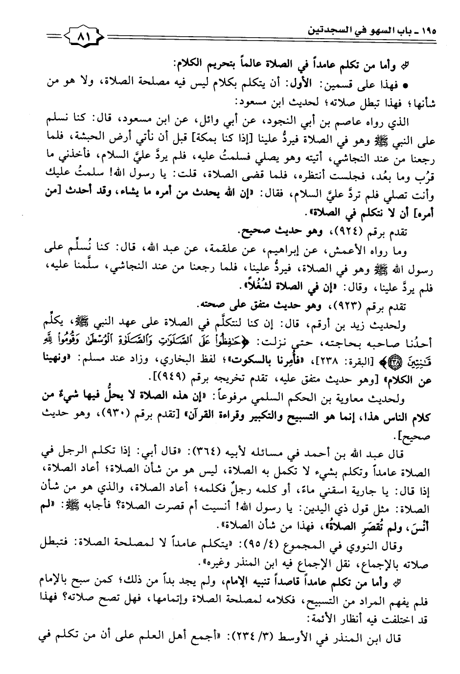 • فهذا على قسمين: الأول: أن يتكلم بكلام ليس فيه مصلحة الصلاة، ولا هو من شأنها؛ فهذا تبطل صلاته؛ لحديث ابن مسعود: