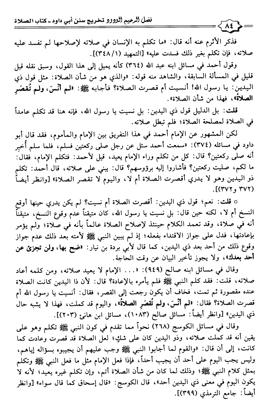 وقال في مسائل ابنه صالح (٩٤٩):". . . الإمام لا يعيد صلاته، ومن كلمه أعاد صلاته، قلت: فقد كلم النبي - صلى الله عليه وسلم - يأمره بالإعادة؟ قال: لأن ذا اليدين كانت الصلاة عنده مقصورة ثم تمت، فخاف أن يكون رجعت إلى القصر، فقال: أنسيت يا رسول الله أم قصرت الصلاة؟ فقال: "لم أنْسَ، ولم تُقصَرِ الصلاةُ"، واليوم قد كملت، فهذا لا يشبه حال ذي اليدين" [وانظر أيضًا: مسائل صالح (١٠٨٣)، مسائل ابن هانئ (٢٠٣)].