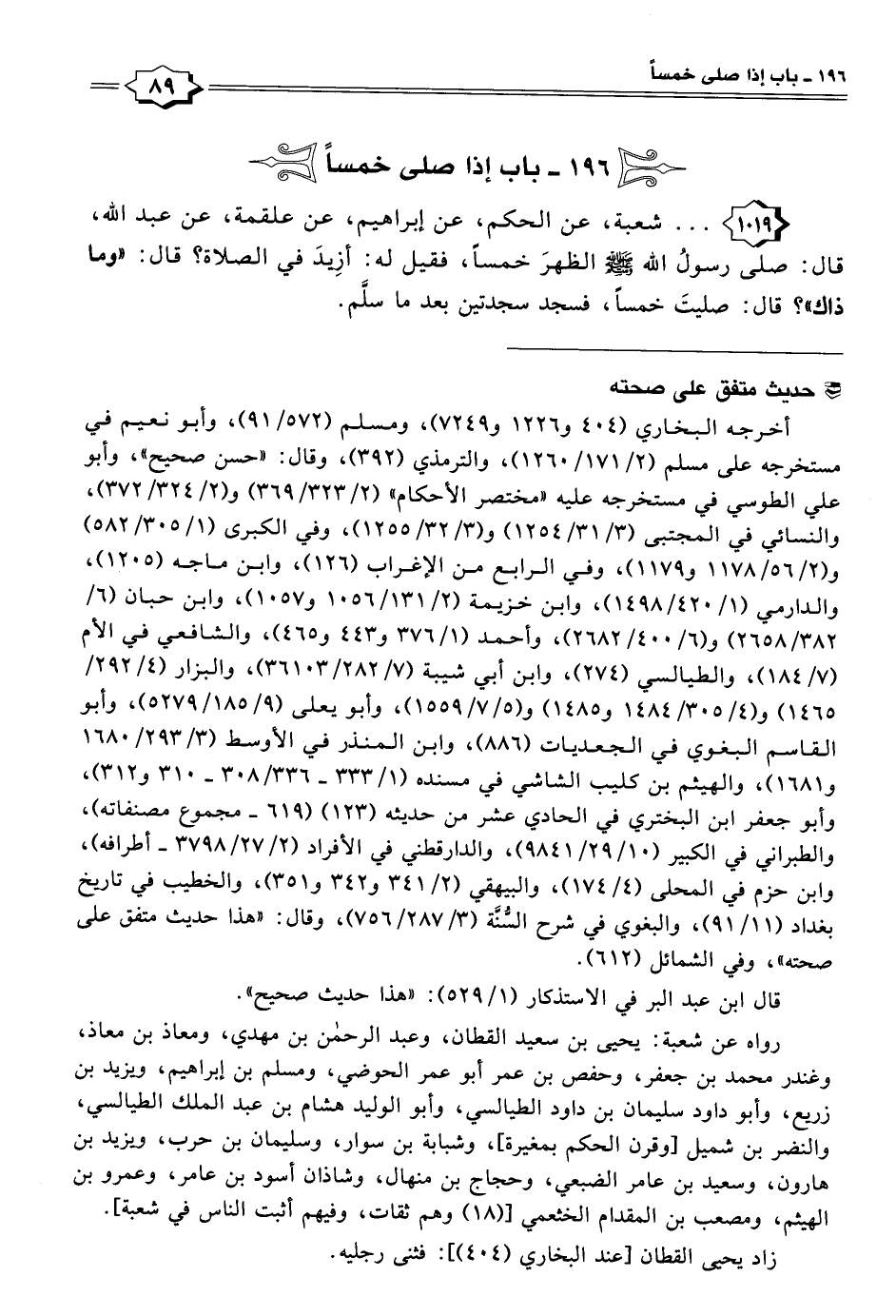١٠١٩ - . . . شعبة، عن الحكم، عن إبراهيم، عن علقمة، عن عبد الله، قال: صلى رسولُ الله - صلى الله عليه وسلم - الظهرَ خمسًا، فقيل له: أزِيدَ في الصلاة؟ قال: "وما ذاك"؟ قال: صليتَ خمسًا، فسجد سجدتين بعد ما سلَّم.