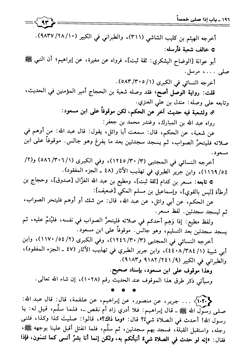 عن شعبة، عن الحكم، قال: سمعت أبا وائل، يقول: قال عبد الله: من أوهم في صلاته فليتحرَّ الصواب، ثم يسجد سجدتين بعد ما يفرغ وهو جالس. موقوفًا على ابن مسعود.