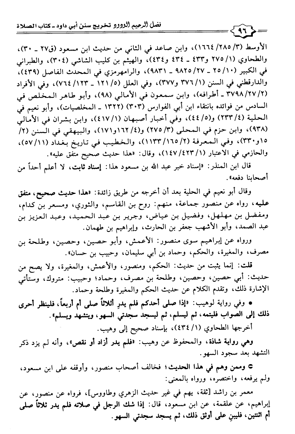 الأوسط (٣/ ٢٨٥/ ١٦٦٤)، وابن صاعد في الثاني من حديث ابن مسعود (ق ٢٧ - ٣٠)، والطحاوي (١/ ٢٧٥ و ٤٣٣ - ٤٣٤ و ٤٣٤)، والهيثم بن كليب الشاشي (٣٠٤)، والطبراني في الكبير (١٠/ ٢٥ - ٢٧/ ٩٨٢٥ - ٩٨٣١)، والرامهرمزي في المحدث الفاصل (٤٣٩)، والدارقطني في السنن (١/ ٣٧٦ و ٣٧٧)، وفي العلل (٥/ ١٢١ - ١٢٣/ ٧٦٤)، وفي الأفراد (٢/ ٣٧٩٨/٢٧ - أطرافه)، وابن سمعون في الأمالي (٩٨)، وأبو طاهر المخلص في السادس من فوائده بانتقاء ابن أبى الفوارس (٣٠٣) (١٣٢٢ - المخلصيات)، وأبو نعيم في الحلية (٤/ ٢٣٣) و (٥/ ٤٤)، وفي أخبار أصبهان (١/ ٤١٧)، وابن بشران في الأمالي (٩٣٨)، وابن حزم في المحلى (٣/ ٢٧٥) و (٤/ ١٦٢ و ١٧١)، والبيهقي في السنن (٢/ ١٥ و ٣٣٠)، وفي المعرفة (٢/ ١٦٥/ ١١٣٣)، والخطيب في تاريخ بغداد (١١/ ٥٧)، والحازمي في الاعتبار (١/ ٤٢٣/ ١٤٧)، وقال: "هذا حديث صحيح متفق عليه".