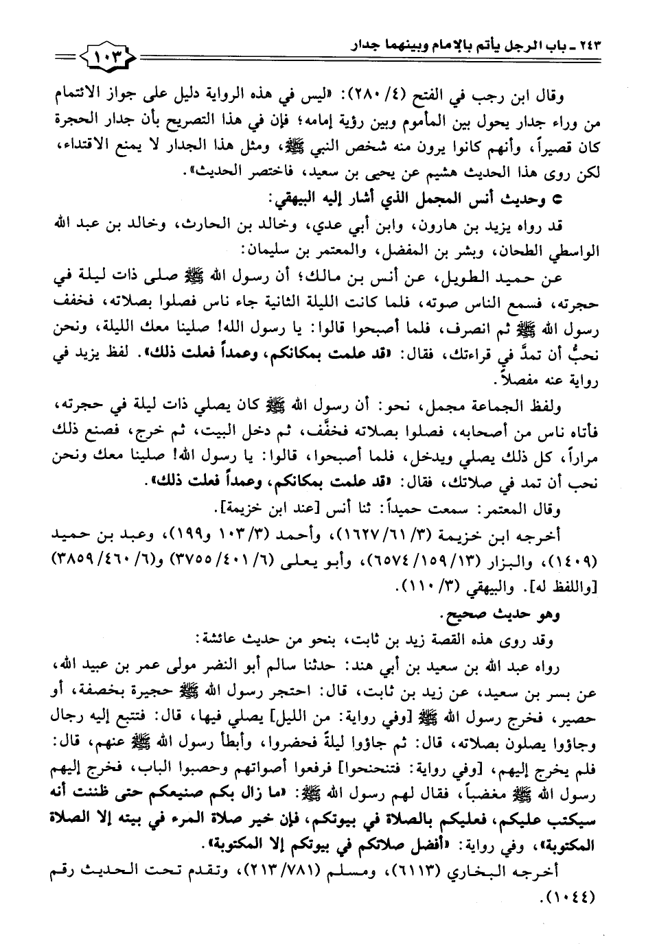 وقال ابن رجب في الفتح (٤/ ٢٨٠): "ليس في هذه الرواية دليل على جواز الائتمام من وراء جدار يحول بين المأموم وبين رؤية إمامه؛ فإن في هذا التصريح بأن جدار الحجرة كان قصيرًا، وأنهم كانوا يرون منه شخص النبي -صلى اللَّه عليه وسلم-، ومثل هذا الجدار لا يمنع الاقتداء، لكن روى هذا الحديث هشيم عن يحيى بن سعيد، فاختصر الحديث".