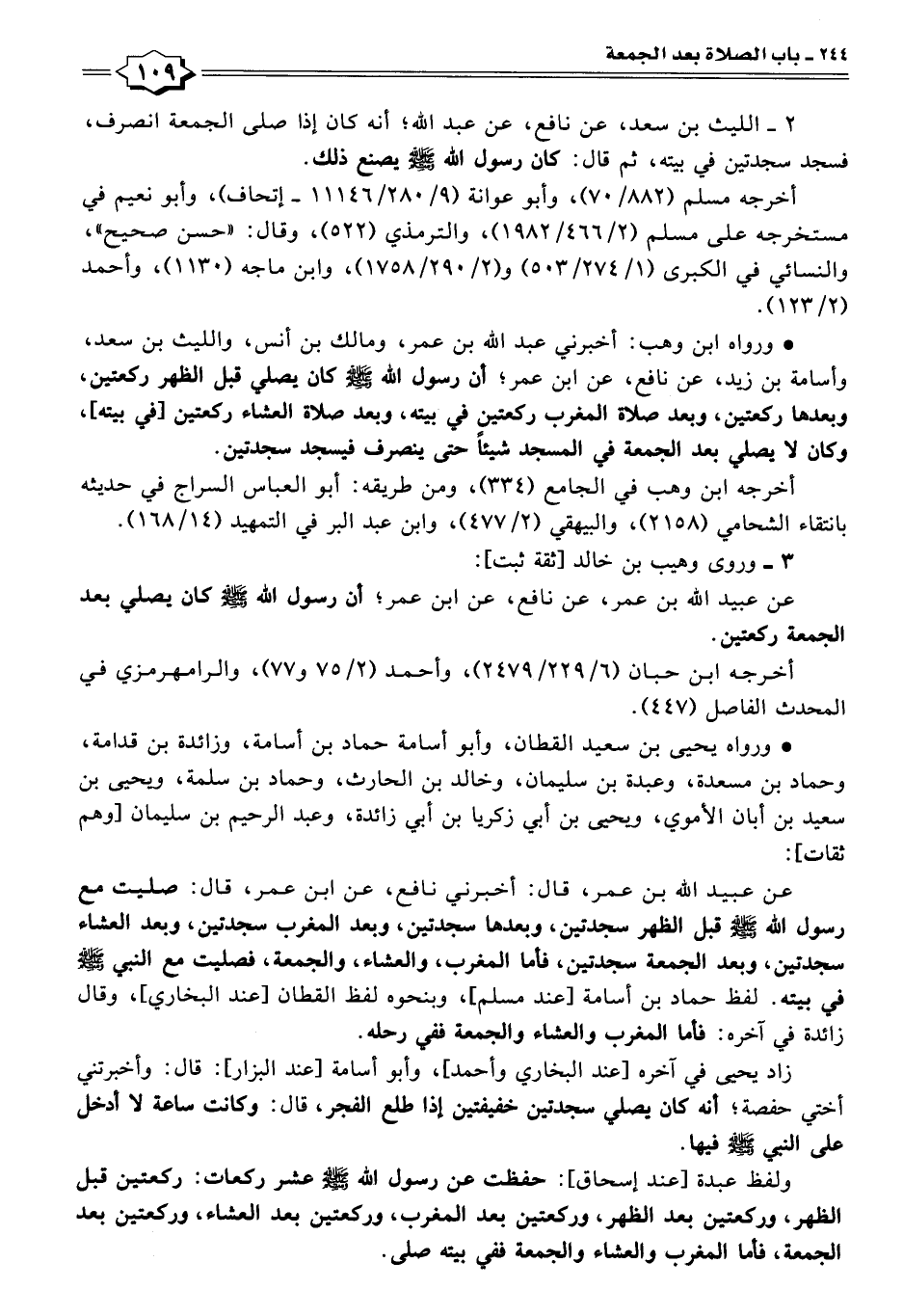 عن عبيد اللَّه بن عمر، عن نافع، عن ابن عمر؛ أن رسول اللَّه -صلى اللَّه عليه وسلم- كان يصلي بعد الجمعة ركعتين.