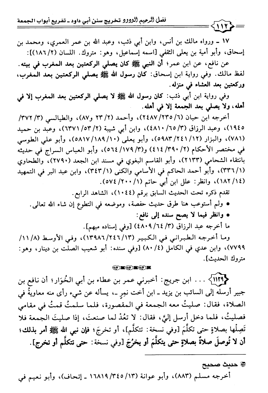 ١١٢٩ - . . . ابن جريج: أخبرني عمر بن عطاء بن أبي الخُوَار؛ أن نافع بن جبير أرسله إلى السائب بن يزيد -ابن أخت نمِرٍ-، يساله عن شيء رأى منه معاويةُ في الصلاة، فقال: صليتُ معه الجمعة في المقصورة، فلما سلمتُ قمتُ في مقامي فصليتُ، فلما دخل أرسل إليَّ، فقال: لا تعُدْ لما صنعتَ، إذا صليتَ الجمعة فلا تَصِلْها بصلاةٍ حتى تكلَّمَ [وفي نسخة: تتكلَّم]، أو تخرجَ؛ فإن نبي اللَّه -صلى اللَّه عليه وسلم- أمر بذلك؛ أن لا تُوصلَ صلاةٌ بصلاةٍ حتى يتكلَّمَ أو يخرُجَ [وفي نسخة: حتى تتكلَّم أو تخرج].