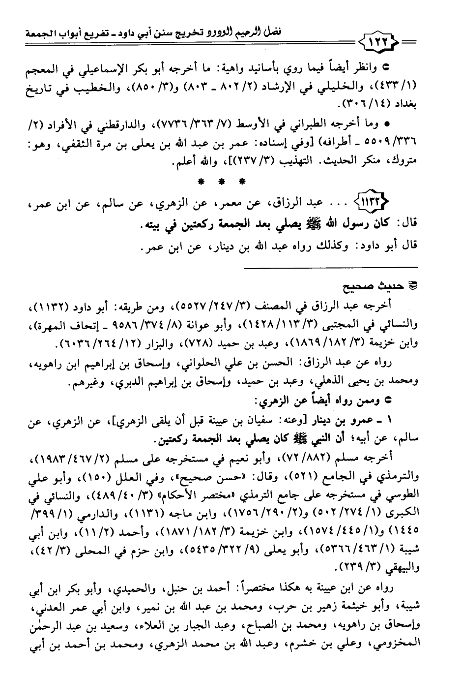 ١١٣٢ - . . . عبد الرزاق، عن معمر، عن الزهري، عن سالم، عن ابن عمر، قال: كان رسول اللَّه -صلى اللَّه عليه وسلم- يصلي بعد الجمعة ركعتين في بيته.
