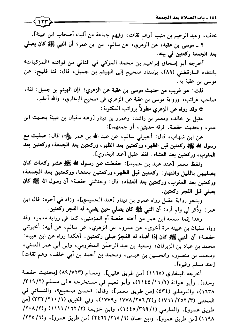٢ - موسى بن عقبة، عن الزهري، عن سالم، عن ابن عمر؛ أن النبي -صلى اللَّه عليه وسلم- كان يصلي بعد الجمعة ركعتين في بيته.