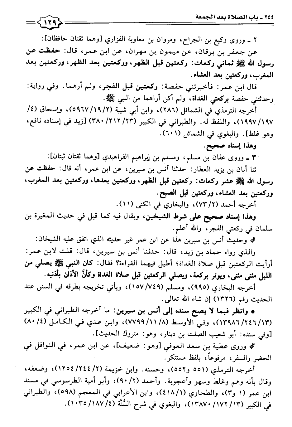 أخرجه الترمذي (٥٥١ و ٥٥٢)، وحسنه. وابن خزيمة (٢/ ٢٤٤/ ١٢٥٤)، وضعفه، وقال بأنه وهم وغلط وسهو وأعجوبة. وأحمد (٢/ ٩٠)، وأبو أمية الطرسوسي في مسند ابن عمر (١ و ٣)، والطحاوي (١/ ٤١٨)، وابن الأعرابي في المعجم (٥٩٨)، والطبراني في الكبير (١٣/ ١٧٢/ ١٣٨٧٠)، والبغوي في شرح السُّنَّة (٤/ ١٨٧/ ١٠٣٥).
