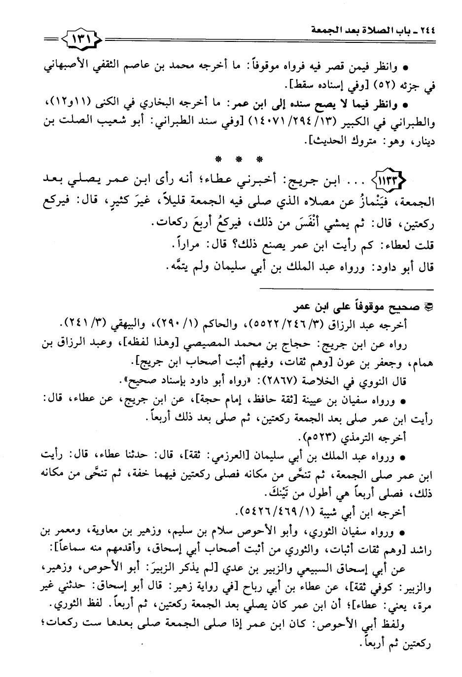 ١١٣٣ - . . . ابن جريج: أخبرني عطاء؛ أنه رأى ابن عمر يصلي بعد الجمعة، فيَنْمازُ عن مصلاه الذي صلى فيه الجمعة قليلًا، غيرَ كثيرٍ، قال: فيركع ركعتين، قال: ثم يمشي أنْفَسَ من ذلك، فيركعُ أربعَ ركعات.