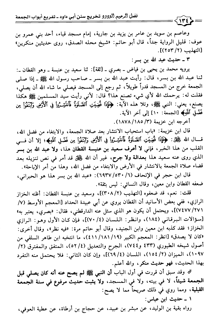قال ابن خزيمة: "باب استحباب الانتشار بعد صلاة الجمعة، والابتغاء من فضل اللَّه، قال اللَّه -عز وجل-: {فَإِذَا قُضِيَتِ الصَّلَاةُ فَانْتَشِرُوا فِي الْأَرْضِ وَابْتَغُوا مِنْ فَضْلِ اللَّهِ}؛ إلا أن في القلب من هذا الخبر، فإني لا أعرف سعيد بن عنبسة القطان هذا، ولا عبد اللَّه بن بسر الذي روى عنه سعيد هذا بعدالة ولا جرح، غير أن اللَّه -عز وجل- قد أمر في نص تنزيله بعد قضاء صلاة الجمعة بالانتشار في الأرض والابتغاء من فضل اللَّه، وهذا من أمر الإباحة".