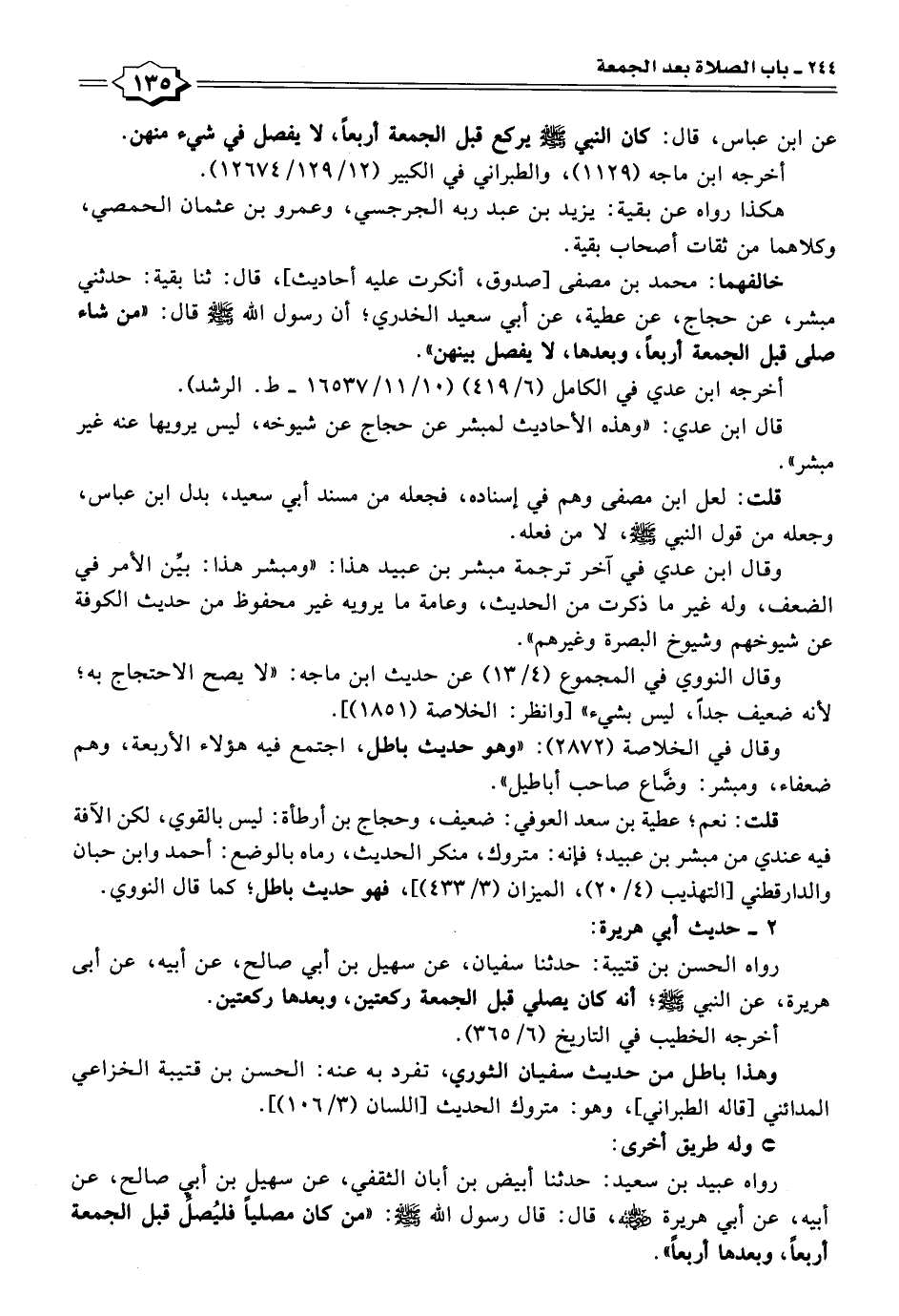 خالفهما: محمد بن مصفى [صدوق، أنكرت عليه أحاديث]، قال: ثنا بقية: حدثني مبشر، عن حجاج، عن عطية، عن أبي سعيد الخدري؛ أن رسول اللَّه -صلى اللَّه عليه وسلم- قال: "من شاء صلى قبل الجمعة أربعًا، وبعدها، لا يفصل بينهن".