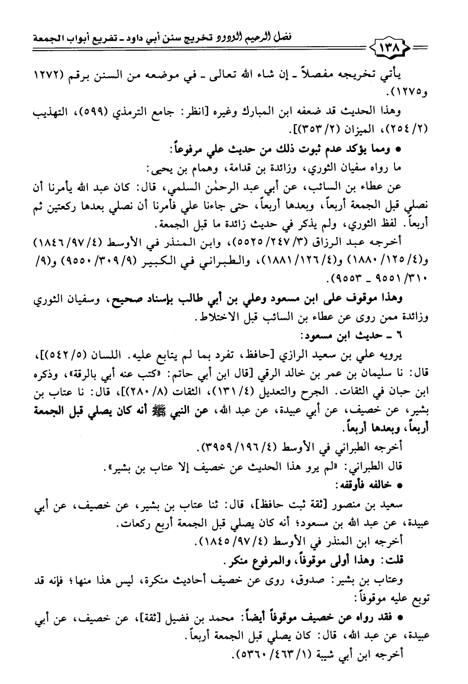 • فقد رواه عن خصيف موقوفًا أيضًا: محمد بن فضيل [ثقة]، عن خصيف، عن أبي عبيدة، عن عبد اللَّه، قال: كان يصلي قبل الجمعة أربعًا.