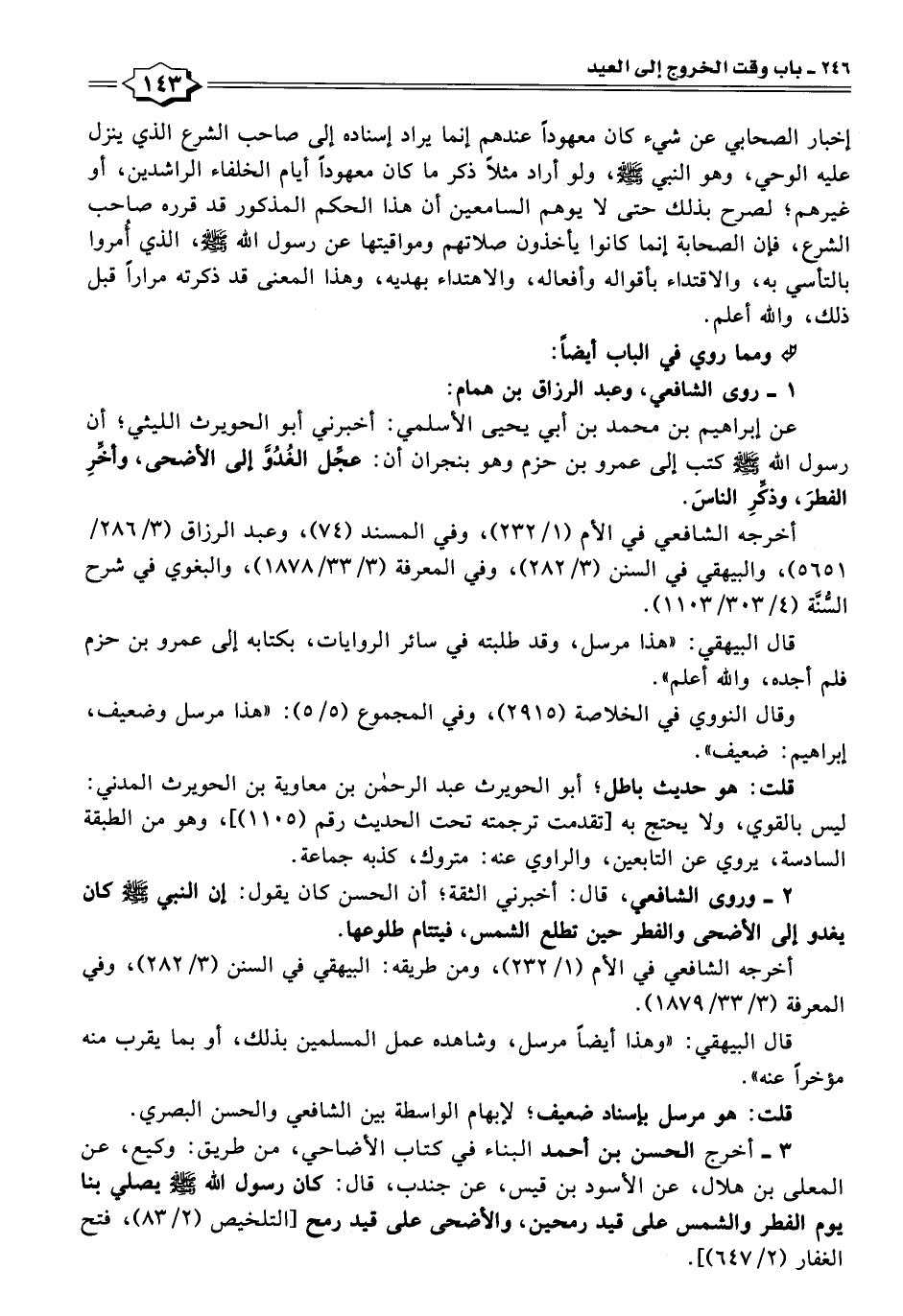 عن إبراهيم بن محمد بن أبي يحيى الأسلمي: أخبرني أبو الحويرث الليثي؛ أن رسول اللَّه -صلى اللَّه عليه وسلم- كتب إلى عمرو بن حزم وهو بنجران أن: عجَّل الغُدُوَّ إلى الأضحى، وأخِّرِ الفطرَ، وذكِّرِ الناسَ.