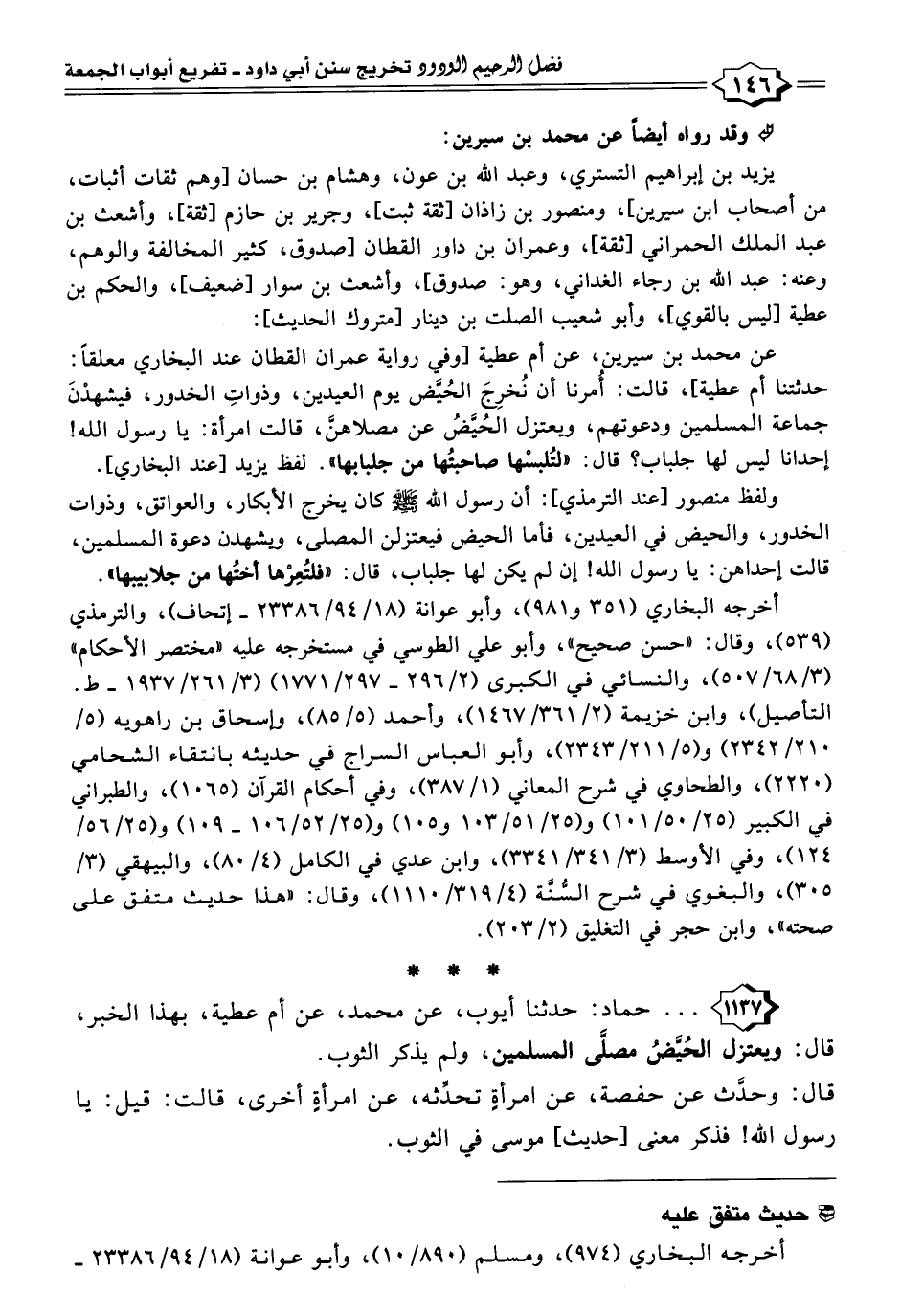 عن محمد بن سيرين، عن أم عطية [وفي رواية عمران القطان عند البخاري معلقًا: حدثتنا أم عطية]، قالت: أُمرنا أن نُخرِجَ الحُيَّض يوم العيدين، وذواتِ الخدور، فيشهدْنَ جماعة المسلمين ودعوتهم، ويعتزل الحُيَّضُ عن مصلاهنَّ، قالت امرأة: يا رسول اللَّه! إحدانا ليس لها جلباب؟ قال: "لتُلبسْها صاحبتُها من جلبابها". لفظ يزيد [عند البخاري].